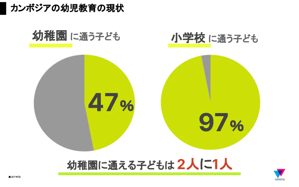 こちらはカンボジアの幼稚園に通う子どもの割合と小学校に通う子どもの割合をそれぞれ表したものです。これらの円グラフから、カンボジアの小学校に通う子どもの割合が97%であるのに対して幼稚園に通う子どもは約半数であることが分かります。カンボジアの幼児教育は全体に行き届いておらず、小学校入学前に、幼稚園に通う子どもとそうでない子どもの間に学力や人間関係構築のスキルの差が生まれてしまうことが考えられます。子どもが幼稚園に通っていない家庭は子育てにより共働きの機会が失われることで、子供が幼稚園に通っている家庭に比べて所得が低くなることも考えられます。