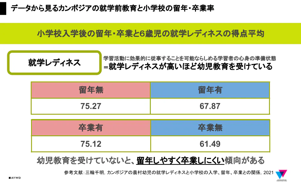 続いて、カンボジアの子どもたちの小学校入学後の留年・卒業の有無と幼児教育の有無の相関関係を表すデータをもとに、幼児教育の大切さについてお伝えできればと存じます。