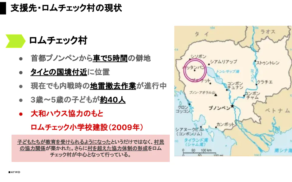 ロムチェック小学校は現地ニーズの収集を担当する開発系NGO・BFDと建設候補地を視察した際に最も学校建設のニーズが高かったロムチェック村を建設地として決定し、大和ハウス株式会社様のご協力のもと、建設いたしました。