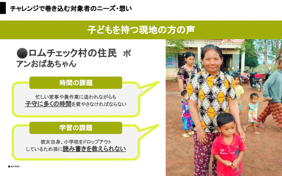 問題を解決するにあたって、ロムチェック村で実際に子育てをしている住民の方、カンボジアバッタンバン州の教育省、早稲田大学の教授や弊会OB、協賛していただいた企業の方にも本チャレンジに対する想いを伺いました。