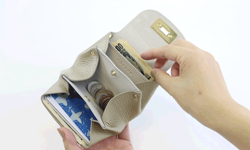 ⇒ミニ財布には多い、お札を折ることなく収納することで、お札の種類の確認にも便利で、お財布内を綺麗に整頓する事にも繋がります。
