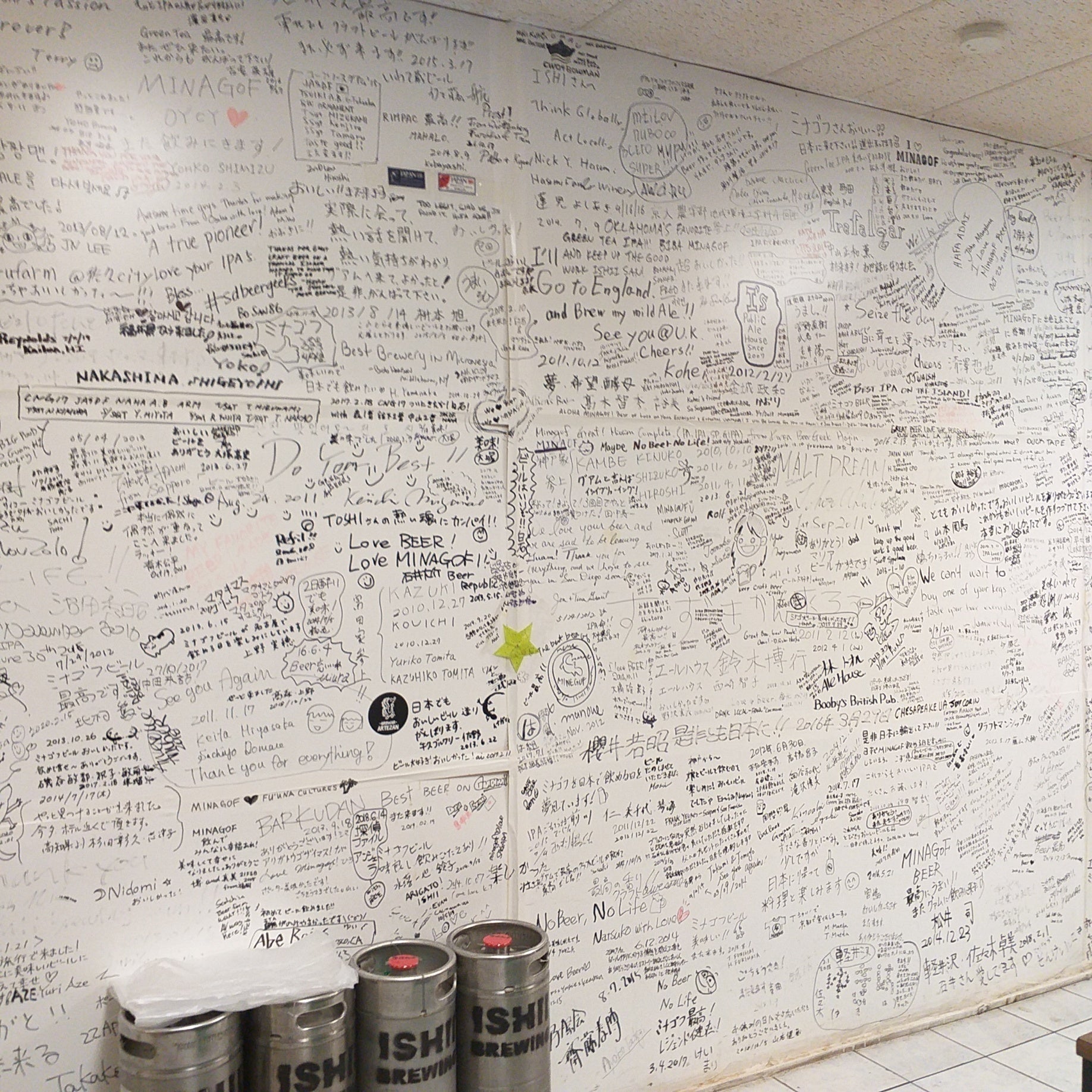 ブルワリーに訪れたファンは、日本・アメリカ・韓国・香港・台湾・東南アジア、イギリス・ロシア・ドイツ・チェコ・ポーランド・オーストラリア・ニュージーランド等々。11年間でサインボードが裏カベまでいっぱいに。 ヤモリ(Gekko/ゲッコー)を守護神にデザイン化、「MINAGOF/ミナゴフ(Happiness, Pleasure, Joy, Cheerという意味の現地チャモロ語)ブランド」で島内の飲食店、ホテル、コンビニ、小売店に<20Lードラフトビール、1LーGrowler、16オンス(473ml)缶>にて、10種類のCraft Beerを提供。主に日本・アメリカからの観光客、米軍関係者や自衛隊に大好評となります。