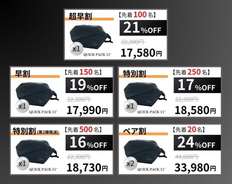2026/03/27 12:30支援者のみなさまいつもプロジェクトの応援ありがとうございます。本日12時よりあなたのワークライフを快適にするボディバッグ「2サイズ同時の限定販売」が公開されました。【タブレット対応】QUICK PACK 11sは「大容量なコンパクトモデル」。普段タブレットや電子書籍とマイボトル程度で通勤される方に最適のサイズ。男性女性問わず“体にフィット”するサイズ感で、1,000名近い方にご愛用頂いています。一方、【A4/PC対応】QUICK PACK 15sはリュックは大きい、ショルダーでは小さい...そんなニーズに応える15インチサイズのワーカーズバッグ。ノートPCとA4の書類、充電器にマウスなど、ガジェットをまるっと持ち歩くことが多い方にピッタリ。どちらも斜め掛けでサッと掛けられ、荷物も入れやすい横長の形状。歩きや自転車での通勤にはもちろん、車や電車で荷物のつけ外しが多い方にも便利なバッグ。カジュアルすぎない、でもライトに使える。新しいバッグとフレッシュな気持ちで新年度を迎えてみませんか!?ぜひチェックしてみてください!>>【タブレット対応】QUICK PACK 11s>>【A4/PC対応】QUICK PACK 15s もっと見る