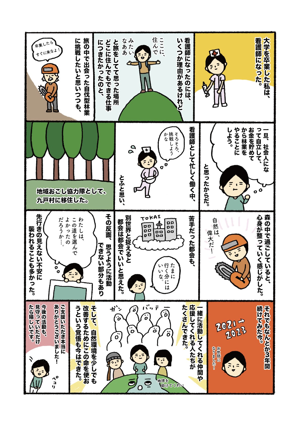 初めてのことばかりでしたが、九戸村の人や近隣市町村の方々に支えられて、林業技術や森について、ひとつひとつ学んできました。
