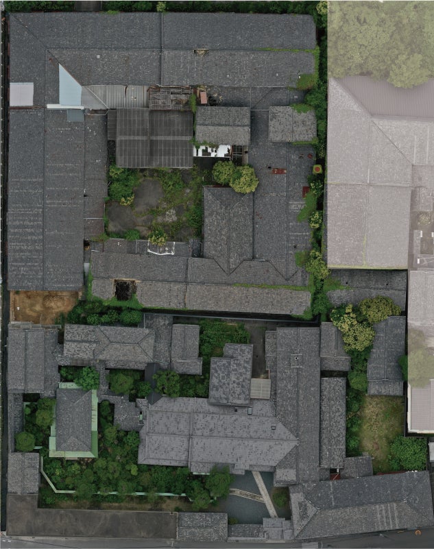 修繕前のため、現在すでにない建物(大きく穴の開いた建物)もありますが、約1800坪(6000㎡)の敷地に木造建築物がひしめき合っています。