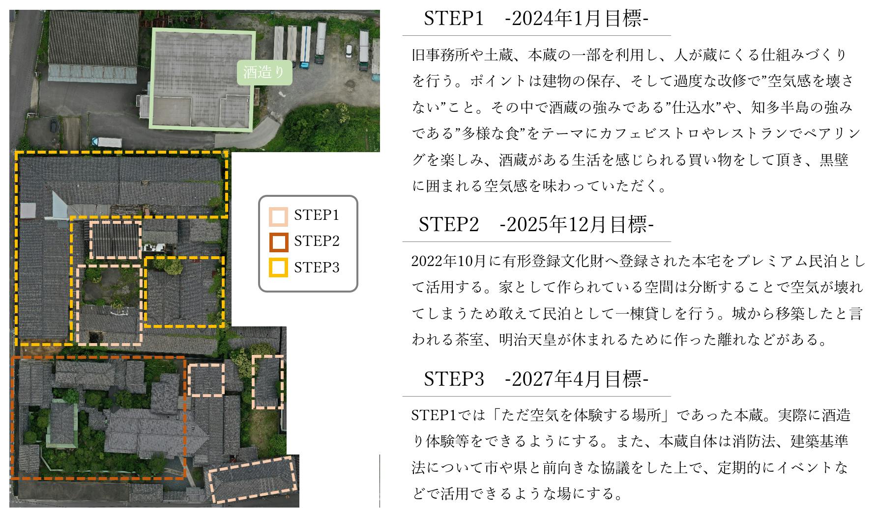 STEP1では、蔵内における、レストランとカフェビストロ、物販店舗の建設。そして庭の整備を行います。