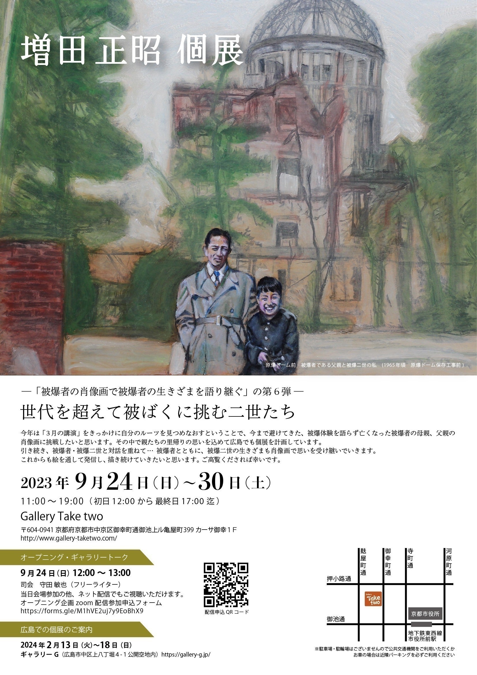 わたしは、京都市在住(53年間) 広島は生まれ育った場所であり、両親が原爆に遭った場所でもあります。ただ、父と母は被爆体験を語らずに亡くなりました。今回、その姿を描くことで自身のルーツを見つめ直そうと、これまでは描くのを避けてきた両親の肖像画を完成させました。「里帰り」の思いを込めて、広島で個展を開催します。
