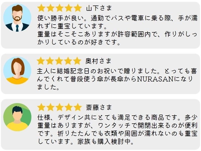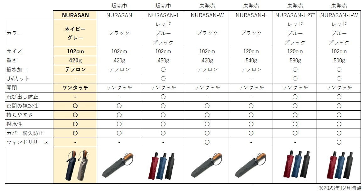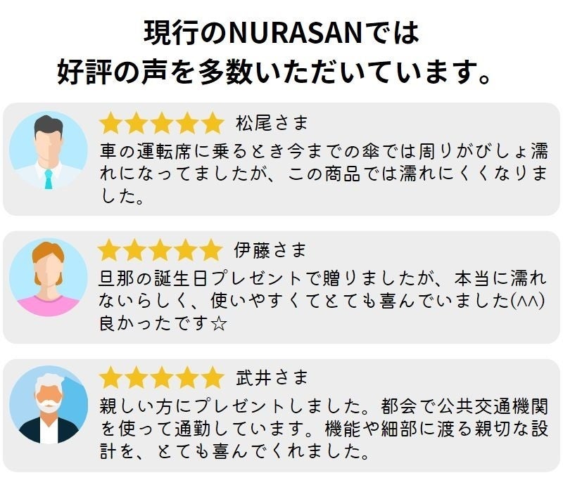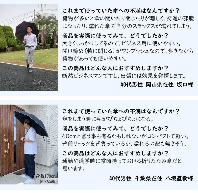 だから、「雨の日をストレスなく過ごしたい!」そんな想いから、当時持っていた折りたたみ傘を見て生まれたのがNURASANです。