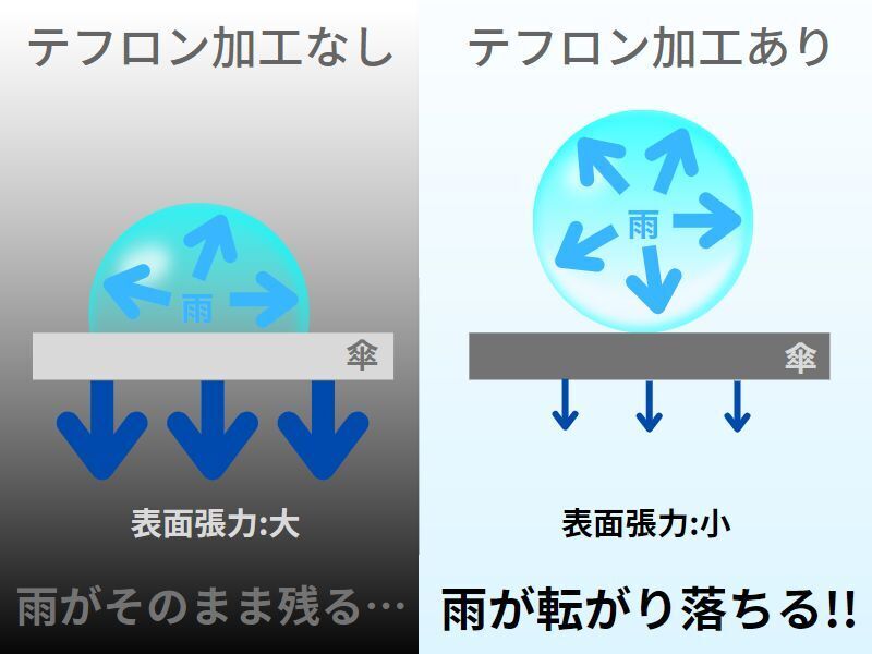 さらに、撥水・防汚を強化するテフロン加工を施し雨粒を傘にとどめずしっかり落とします。