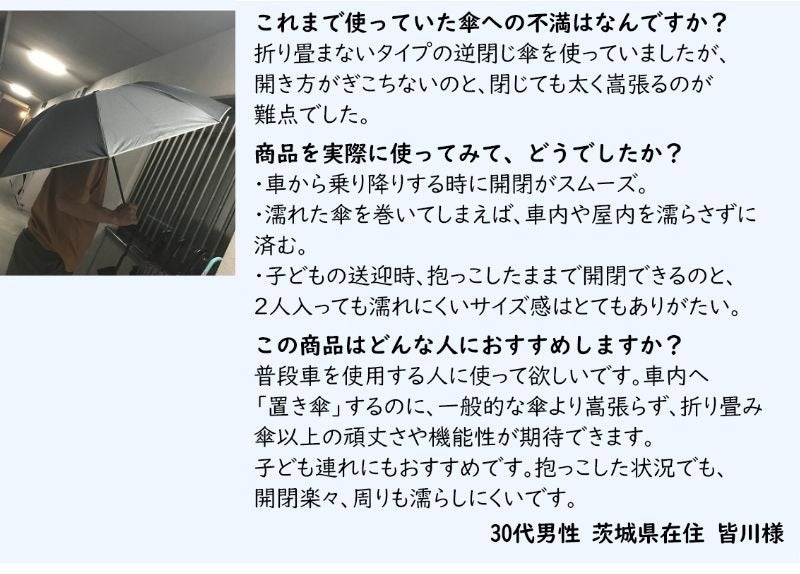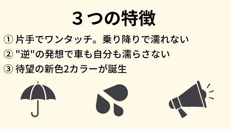 通常とは異なる構造と使いやすさを追求した機能で、雨でも暑い日でも濡らさない、新しい逆折りたたみ傘です。