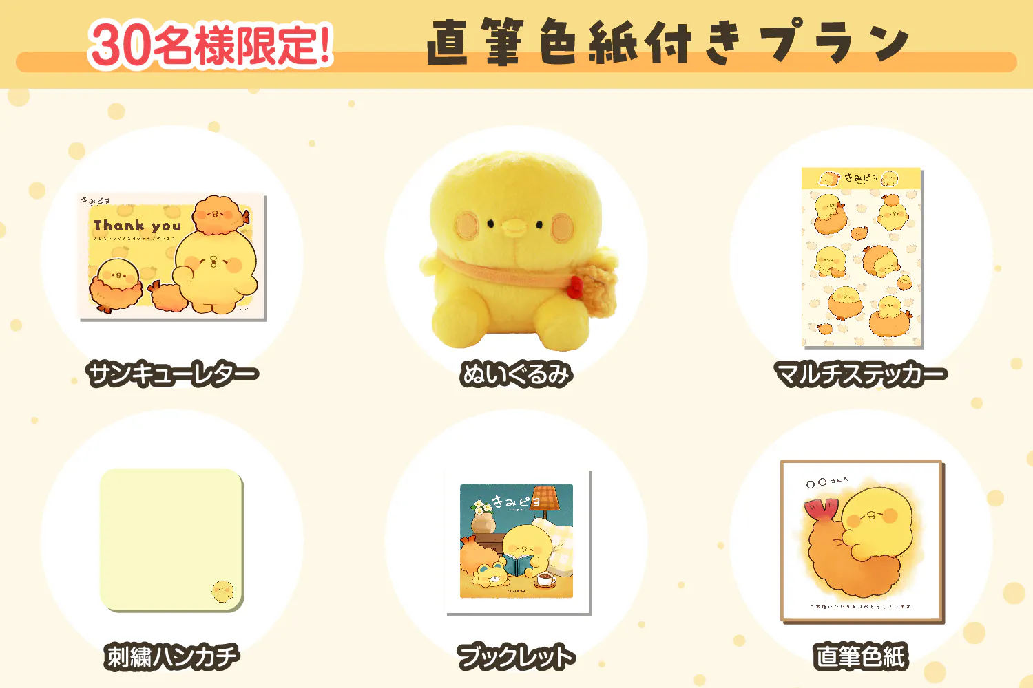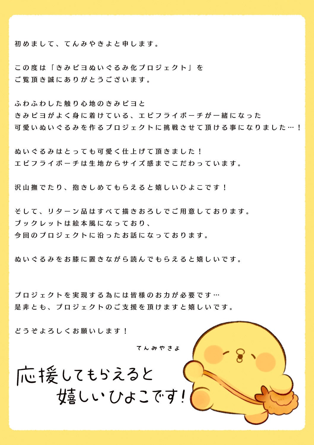 2023/11/27 17:00【ストレッチゴール130%達成いたしました!!】Creationスタッフです。きみピヨへのご支援ありがとうございます!皆様の応援のお陰で支援者全員にクリアファイルのプレゼントも決定しました!!もちろんこれから支援される方も対象となります。ご支援できるのは、今週末の12月3日(日)23:59までなので最後まで応援よろしくお願いいたします! もっと見る⚫︎素敵なお知らせ⚫︎