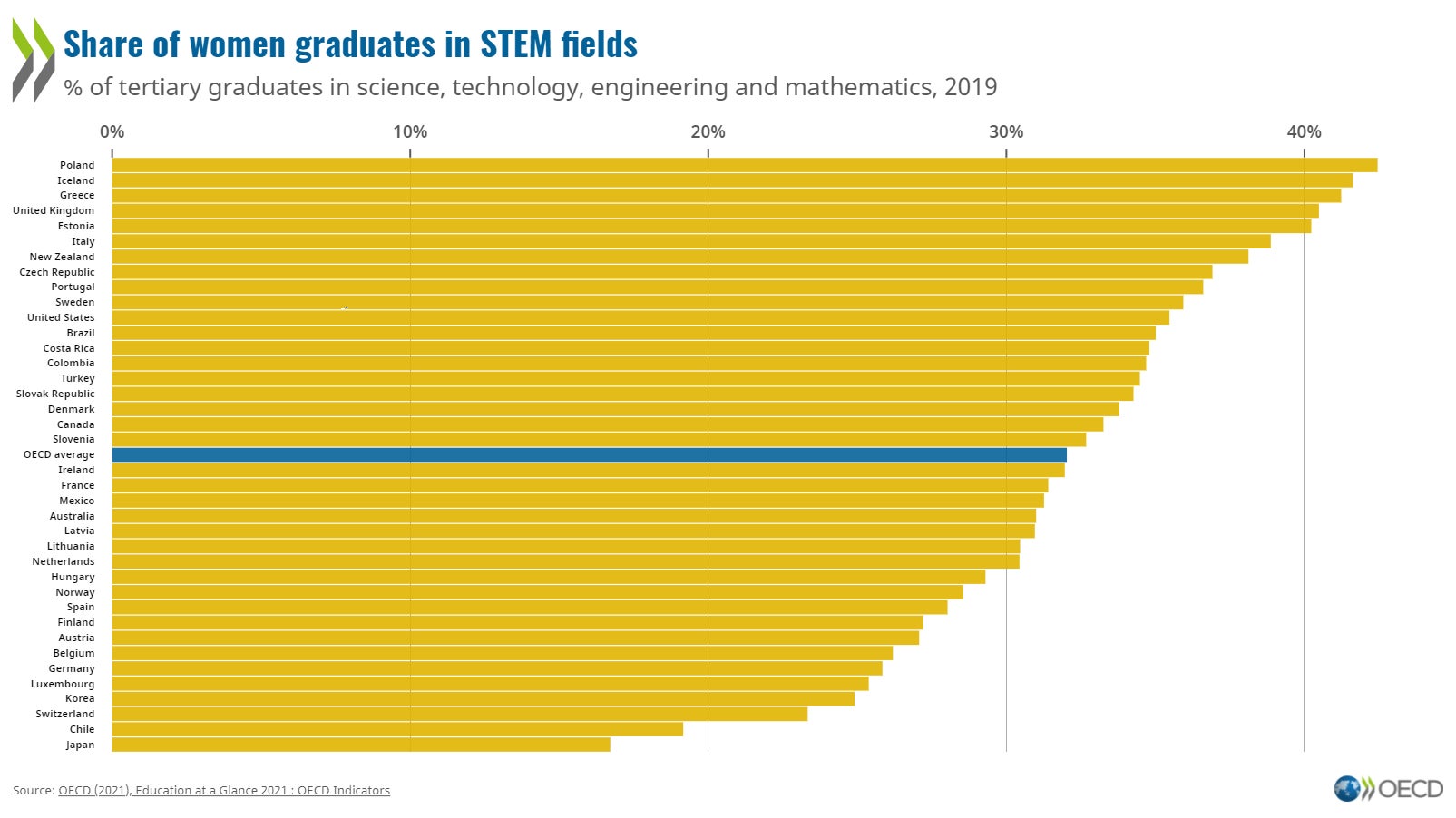 経済協力開発機構(OECD)が加盟各国の大学など高等教育機関の卒業・修了生に占める女性の割合を調べたところ、2021年時点で加盟国中日本は最下位。割合は約17%となっています。
