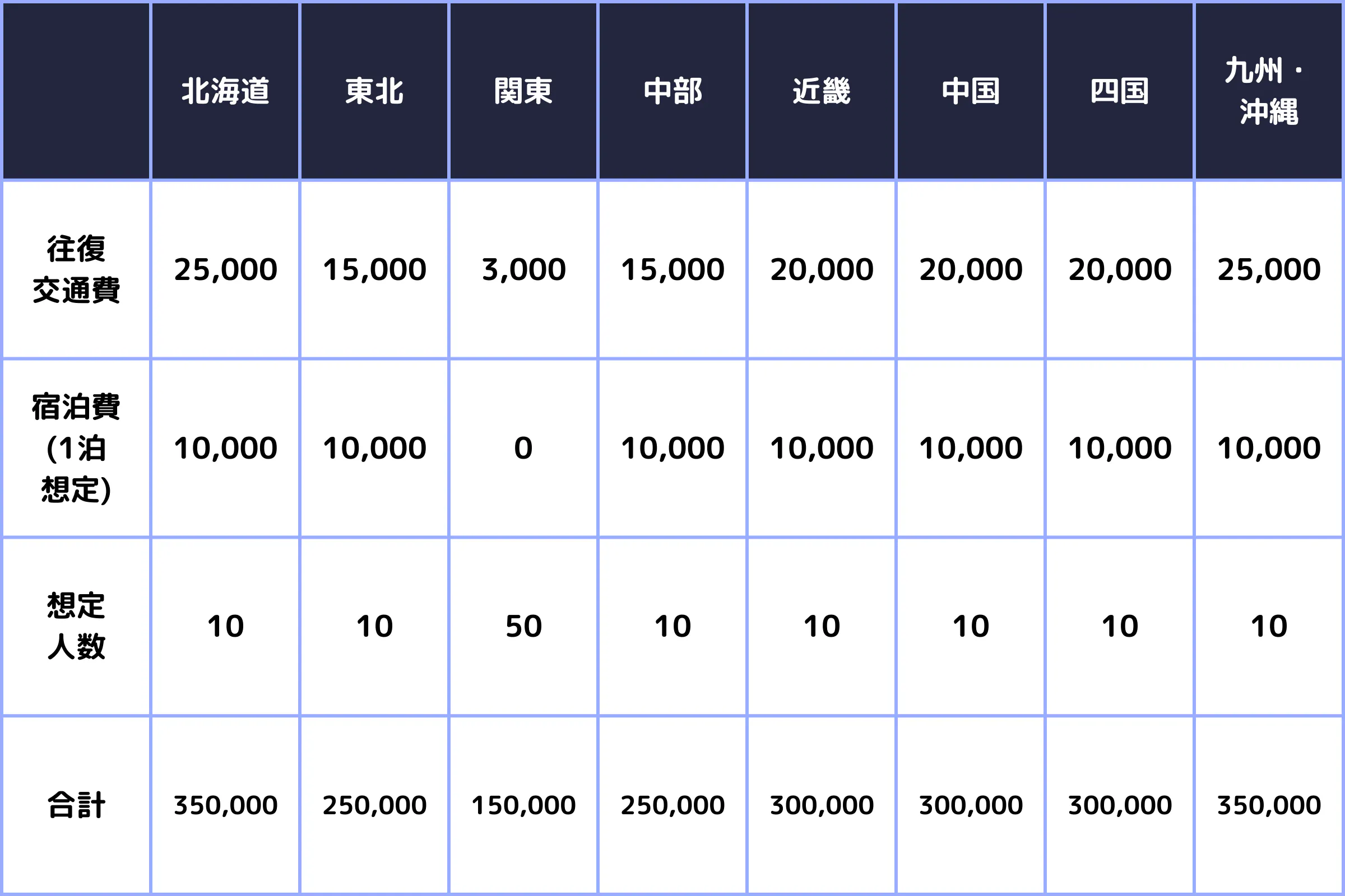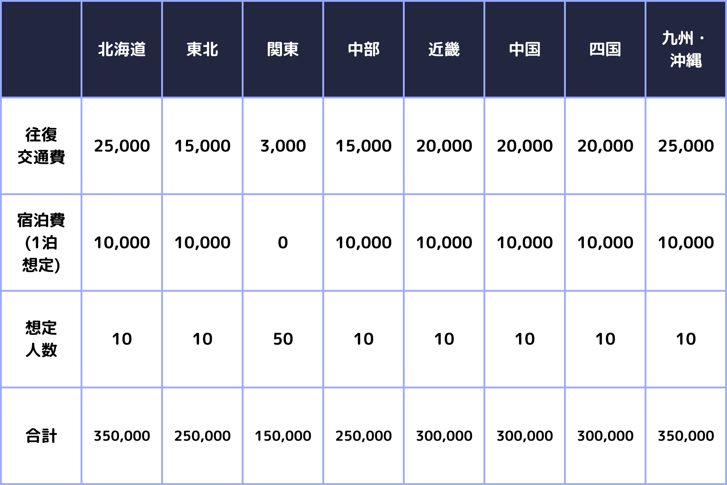 各地域の補助金額および想定人数は以下の通りです。