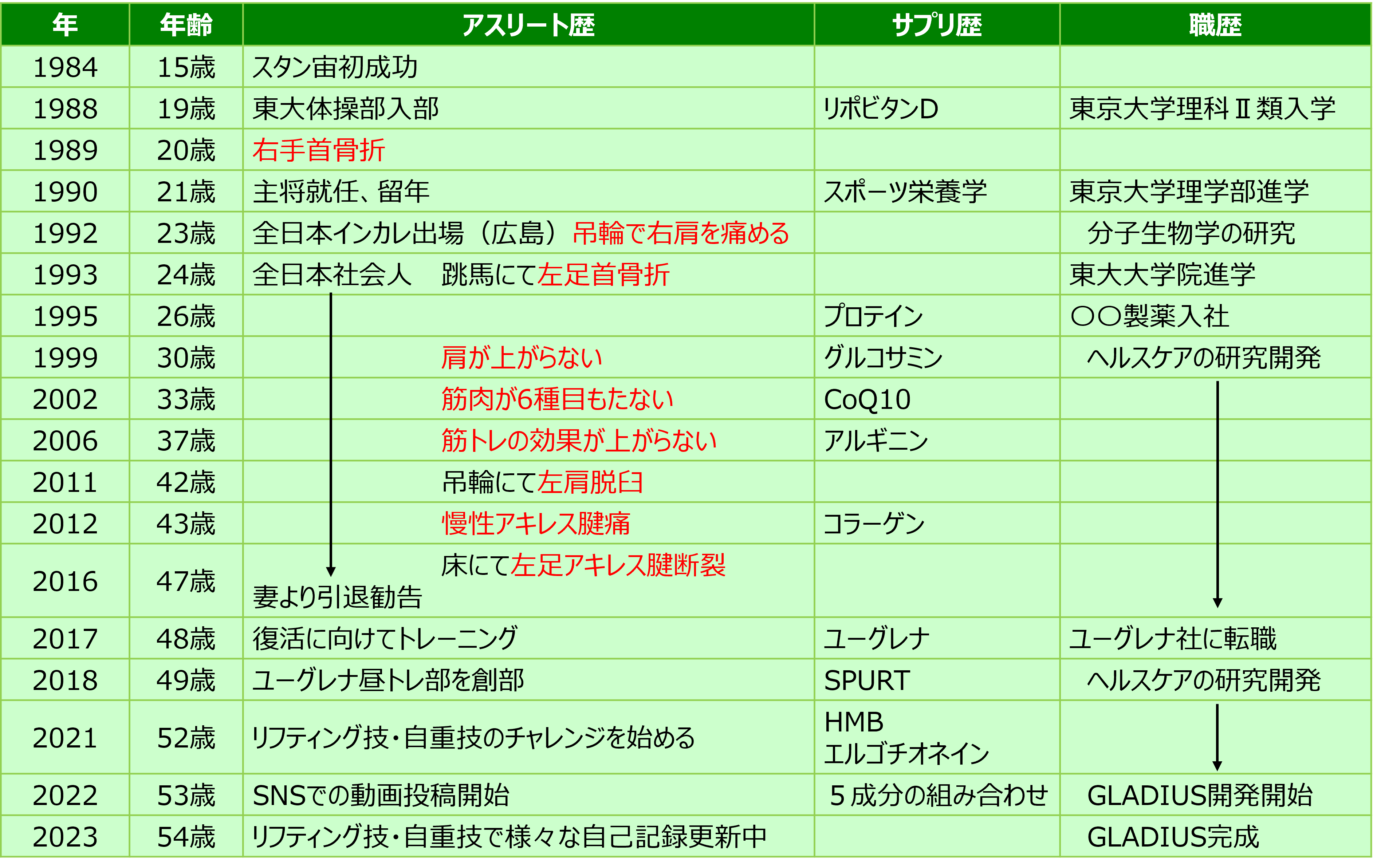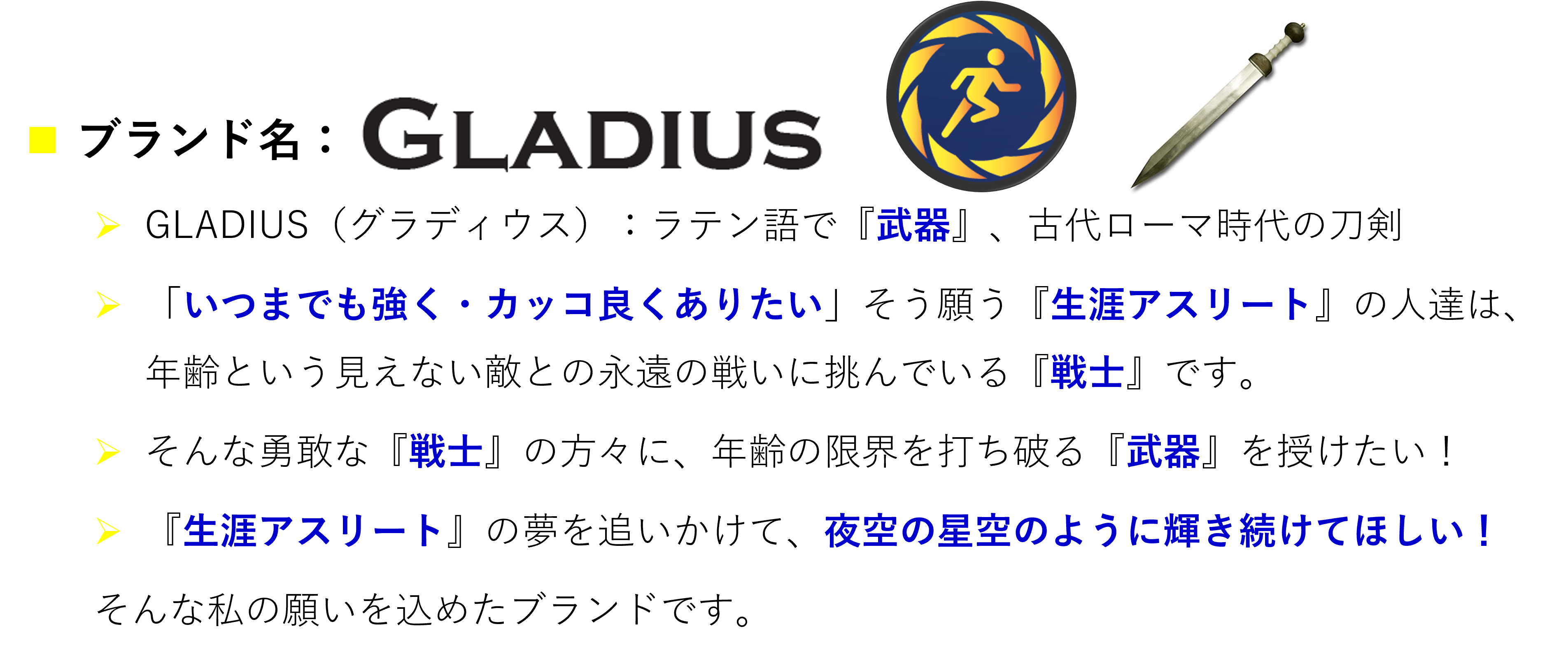 これまではアスリートとしても研究者としても中途半端な人生でした。このまま人生を終えて良いのか? 53歳にして出来ることはないのか? 頭がちぎれるほど悩みに悩んで、ひとつのアイディアが浮かびました! X(旧Twitter)を始めて、自分が『生涯アスリート』のインフルエンサーになろう! そして同じ志の仲間を集めて、その方々に『GLADIUS FIVE CARE』を試してもらおう! 53歳にして人生を賭けたチャレンジに挑むことにしました。こんな取り組みを認めてくれたユーグレナ社の懐の深さに感謝しています。