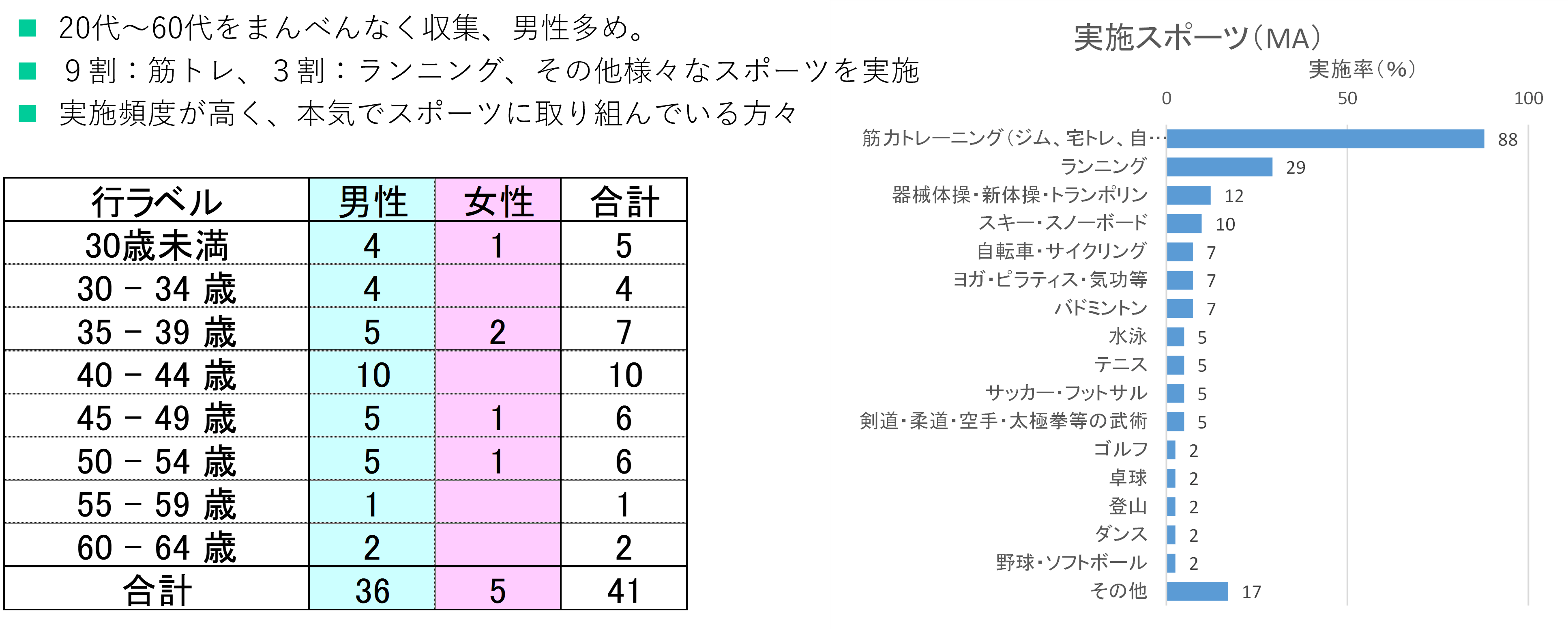 2023年8月、同時に進めていた『GLADIUS FIVE CARE』も完成し、ついにモニター試験を実施するまでに至りました。20代~60代のフォロワーさん41名が快く参加してくれました。驚くべきことに全員が1日18粒の摂取を1ヶ月間継続してくれて、摂取前後のアンケートにも答えてくれました。トレーニングをコツコツ継続している方々は本当に真面目で優しい人たちばかりだなぁと感動しました。