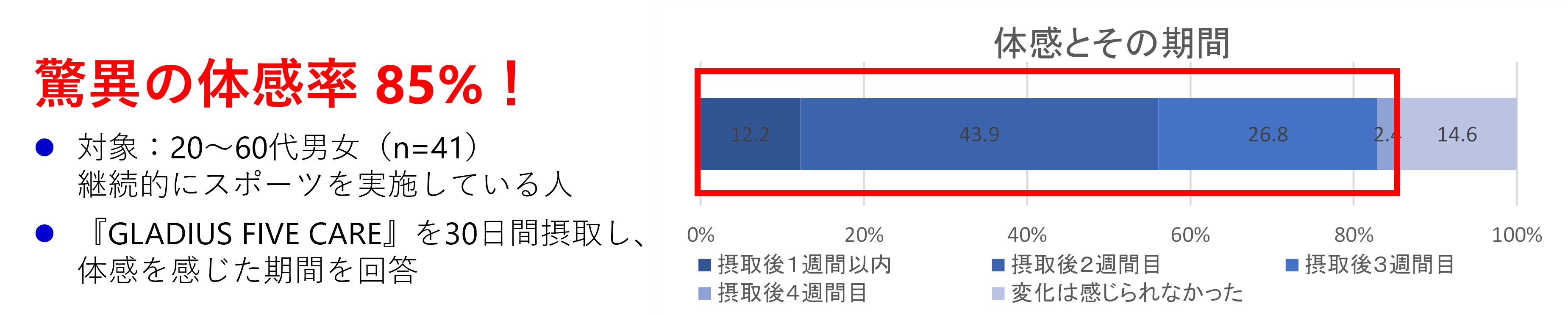 製品プロトタイプを用いたモニター調査では、驚異の体感率85%(n=41)を確認することが出来ました。私個人だけではなく、スポーツを愛し、生涯アスリートを目指して頑張っている全ての方々に、是非とも試して頂きたい商品です!