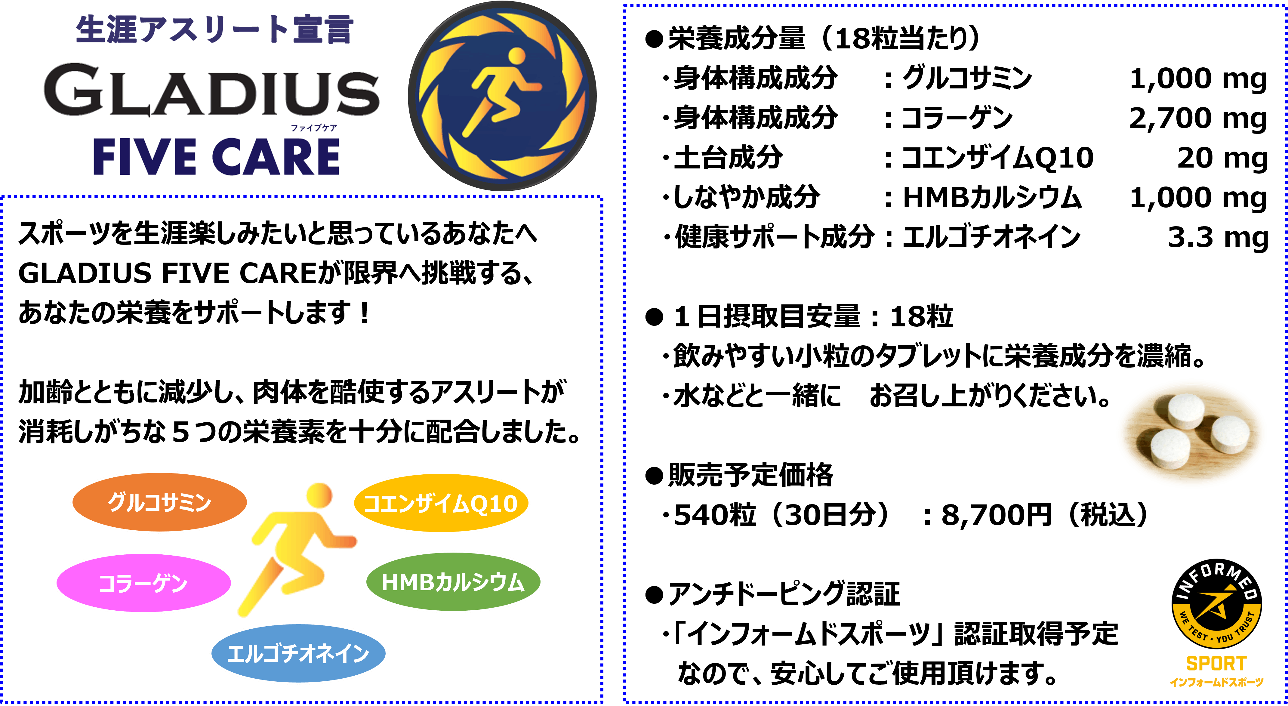 アスリートにとって、パフォーマンスの向上や健やかなトレーニングライフを維持するためには、日々の体づくりに欠かせない優れた栄養素を補うことが不可欠であると考えました。それに見合う栄養成分をひたすら探索していき、30歳でポジティブライフを応援する健康成分『グルコサミン』、33歳で体内に存在する生命活動に重要な補酵素『コエンザイムQ10』、43歳でスムーズな毎日に欠かせない『コラーゲン』、52歳でアスリートの筋力トレーニングを応援する『HMB』、日々のパフォーマンスを支える『エルゴチオネイン』に出会えました。30年間の研究を通じて『GLADIUS FIVE CARE』の5成分に辿り着くことが出来たのです。