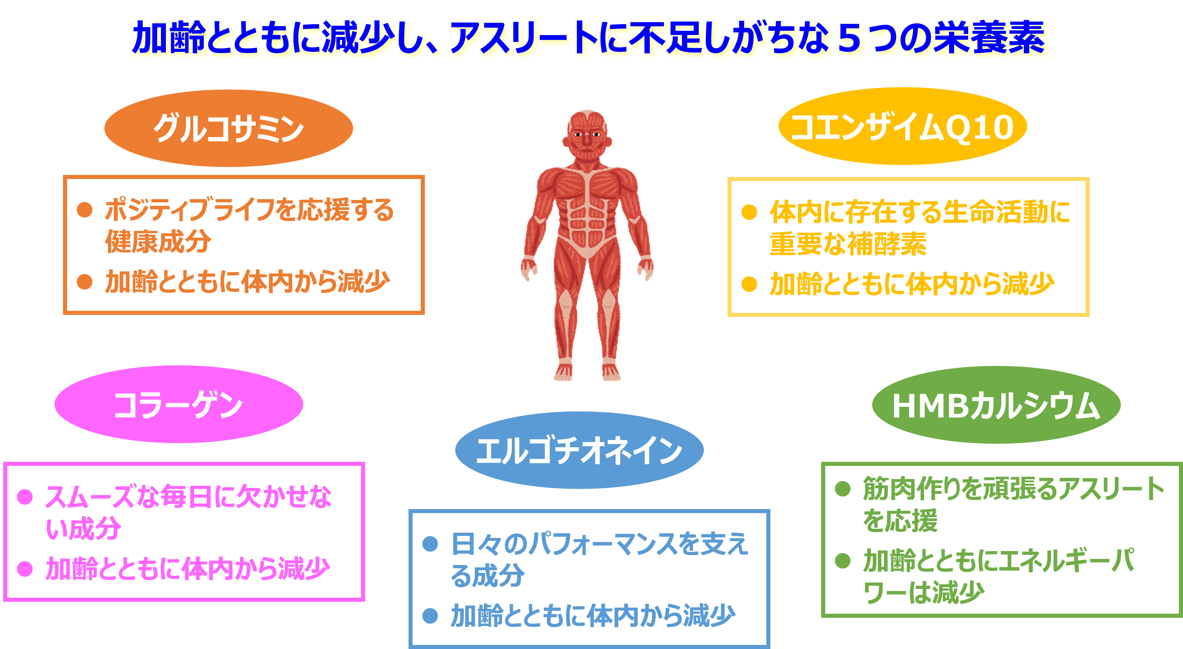 世の中には様々なサプリメントが発売されて情報も氾濫していて、どの成分を摂ればよいのか? どの成分が自分の悩みを解決してくれるのか? 本当に悩ましい状況だと思います。アスリートのパフォーマンスをサポートするという目的であれば、この5成分が必要かつ十分であると、私は現時点で結論づけています。もっと若くからこの5成分を摂取していたら、と思うほど54歳の現在は充実したトレーニング生活を過ごしています(笑)。