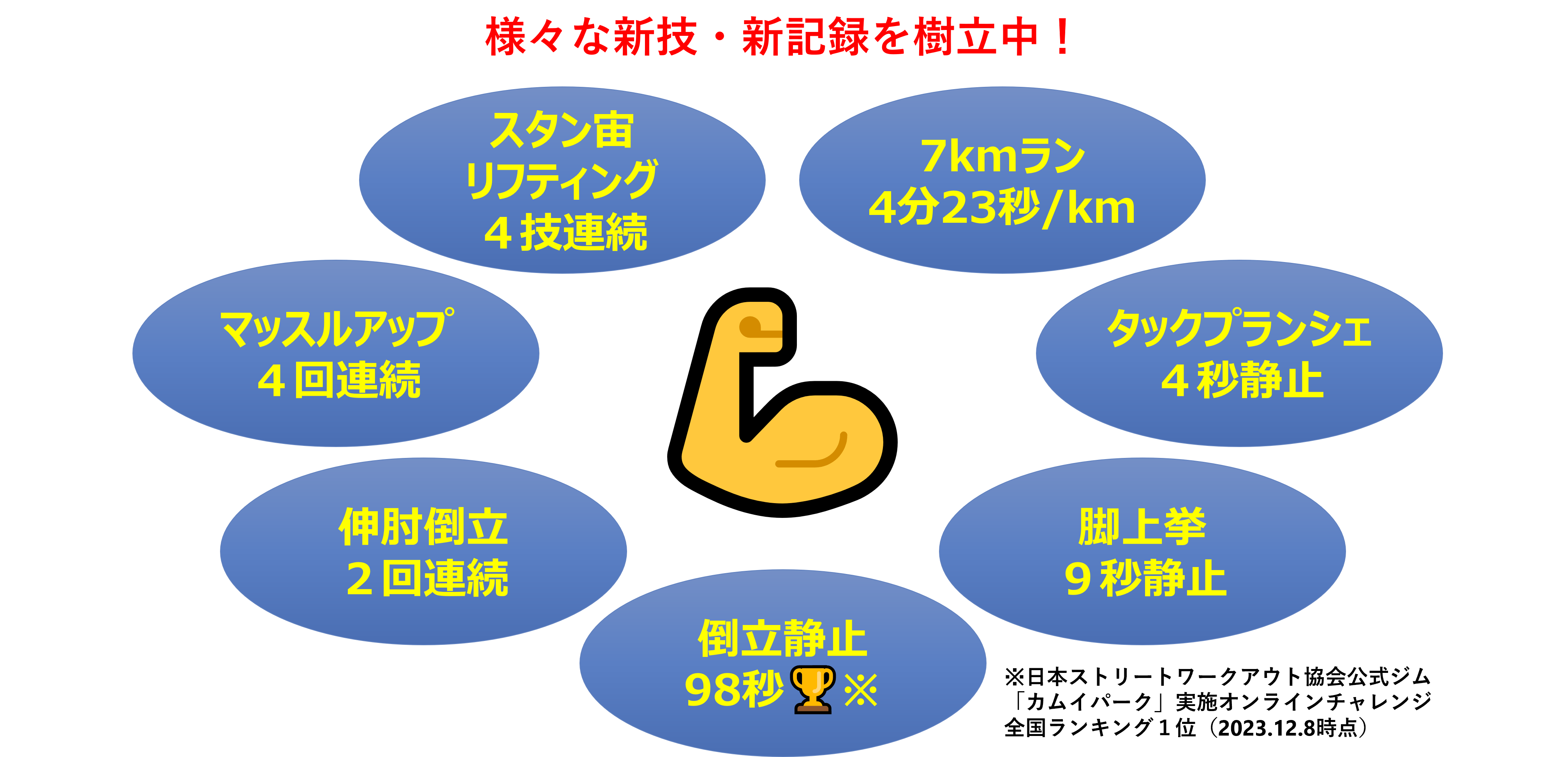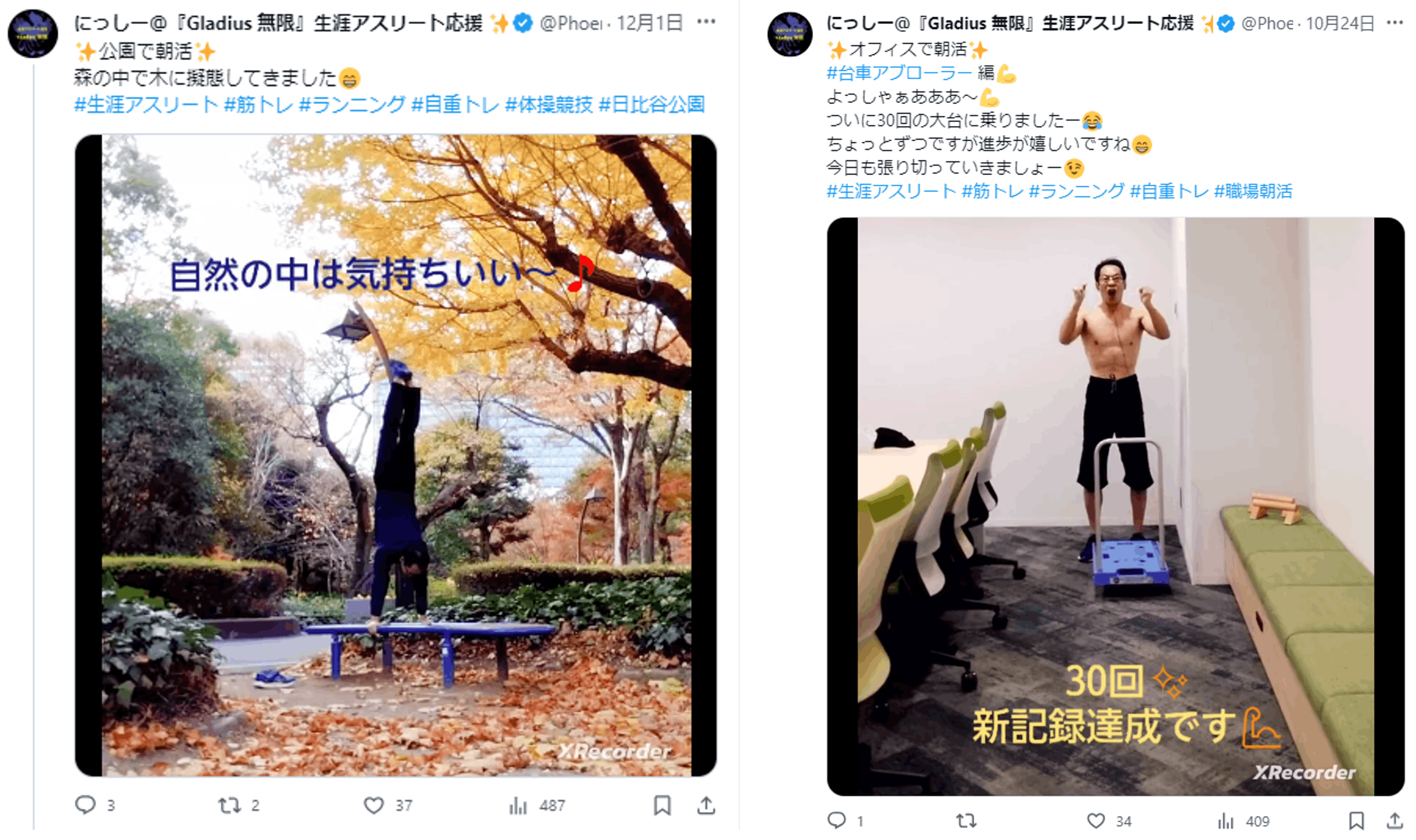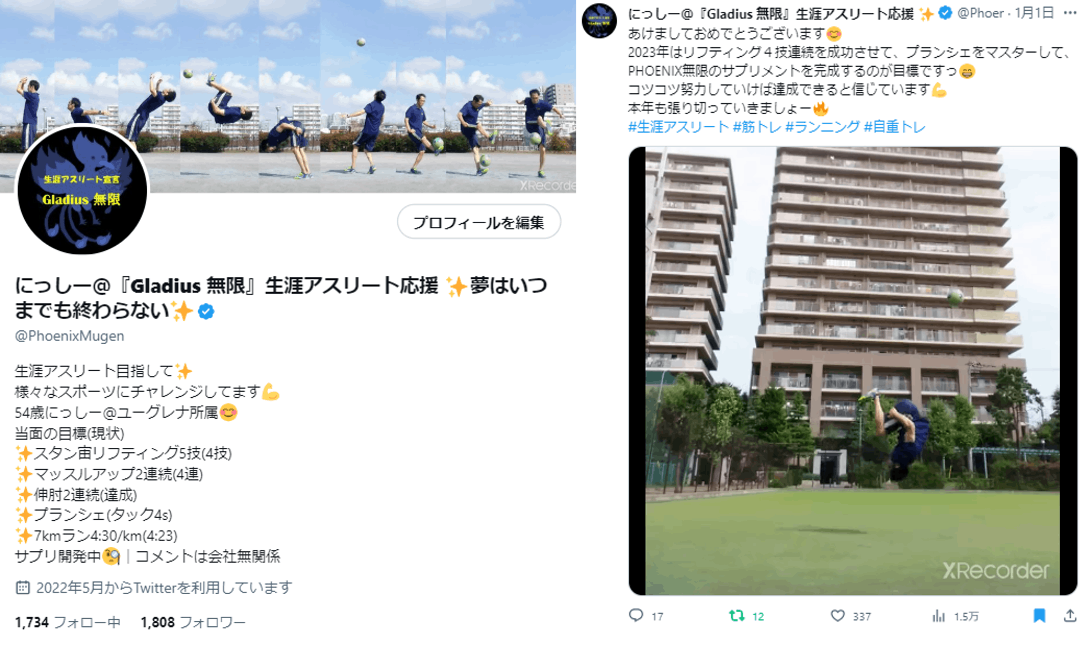 2022年5月にSNSを立ち上げ、1年半でフォロワー1,700人を突破しました。私と同じように「いつまでも強く・カッコ良くありたい」と願い、毎日筋トレやランニングなどのトレーニングを頑張っている方々が日本各地に大勢いることが分かりました!(推定人口267万人)。大勢の仲間たちと毎日、トレーニング動画を見せ合いながら励まし合い、私自身のトレーニングもますます充実したものとなりました。リアルでは出会うことが限られていた『生涯アスリート』を目指す大勢の仲間と出会い、トレーニング情報や悩みを話し合い、お互いに信頼関係を構築することが出来ました。ここで出会えた仲間たちは私にとって、一生大切な宝物のような存在です。