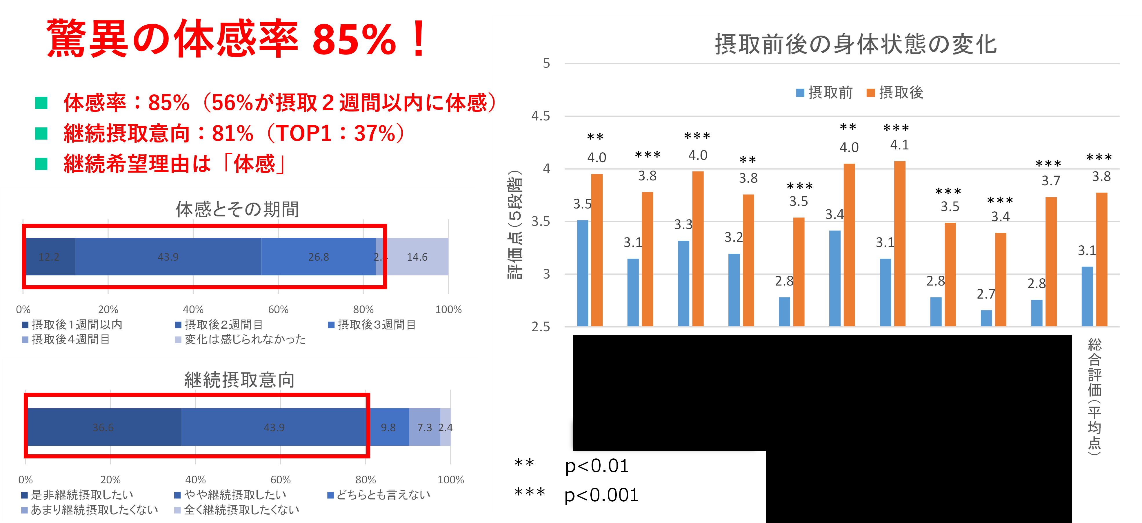 アンケートの結果は私の期待の更に上を行く、素晴らしい結果でした。なんと驚異の体感率85%をたたき出したのです。30年間ヘルスケアの研究開発に関わってきましたが、こんなにはっきりとデータに現れた商品を見たことはありません。
