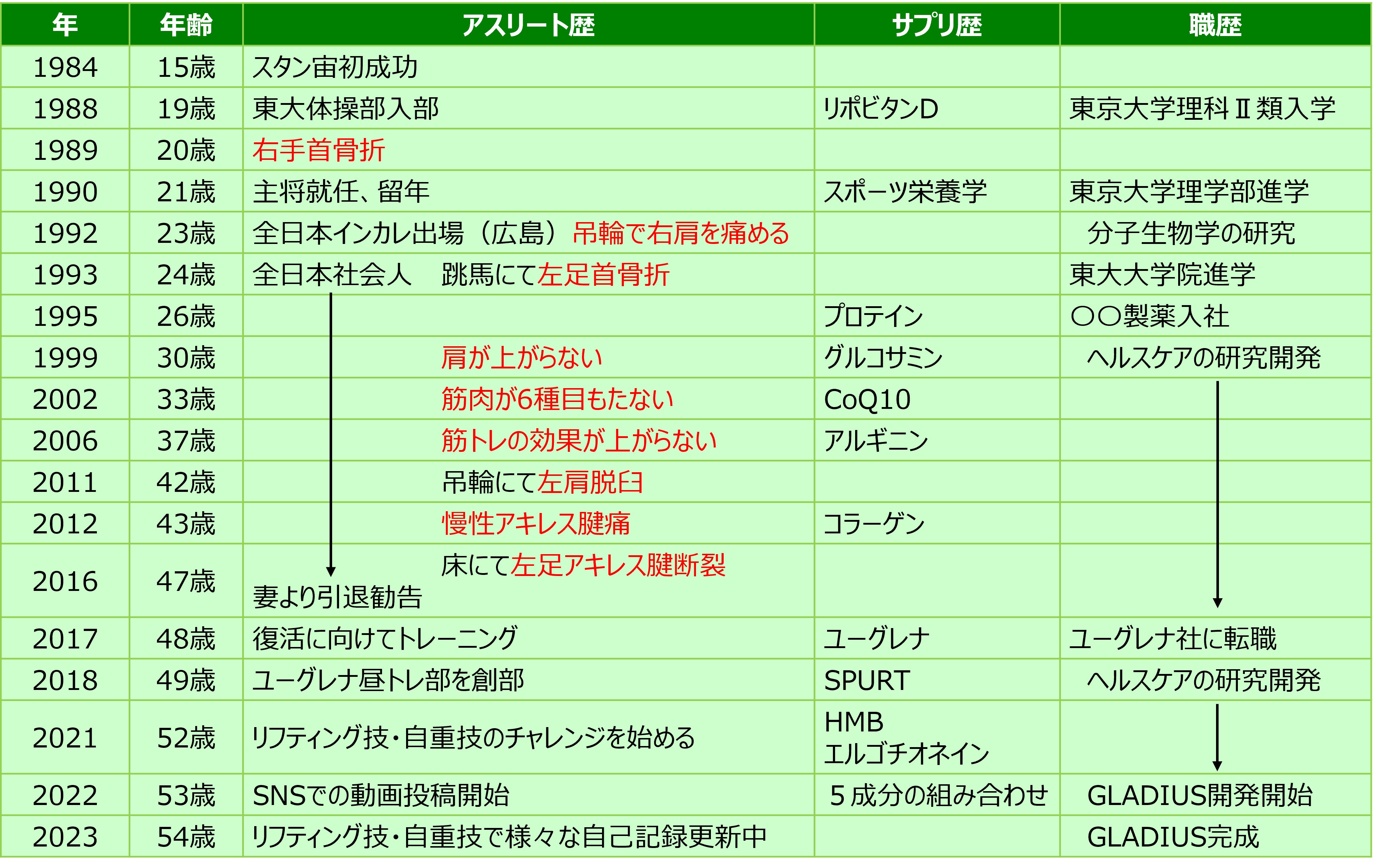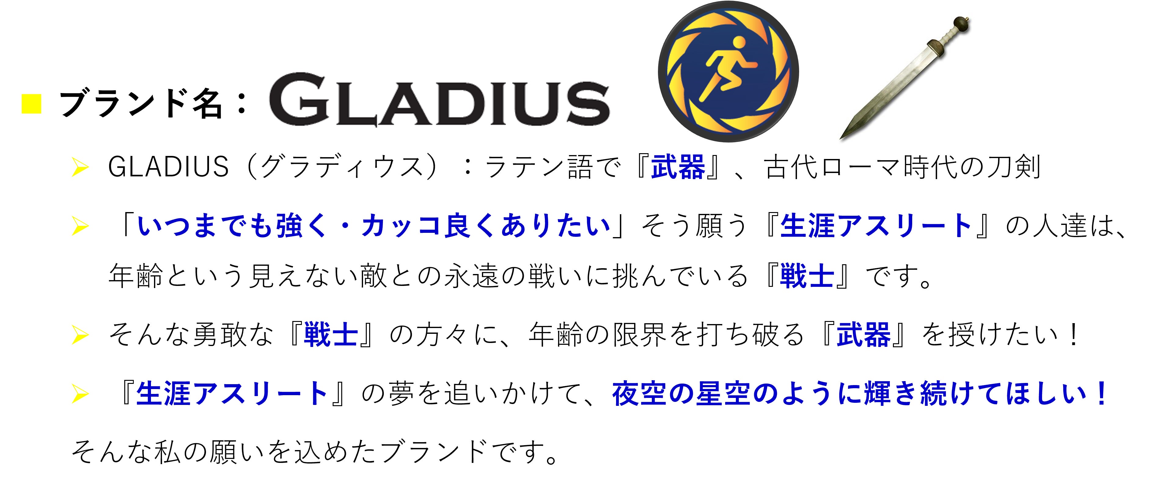 これまではアスリートとしても研究者としても中途半端な人生でした。このまま人生を終えて良いのか? 53歳にして出来ることはないのか? 頭がちぎれるほど悩みに悩んで、ひとつのアイディアが浮かびました! X(旧Twitter)を始めて、自分が『生涯アスリート』のインフルエンサーになろう! そして同じ志の仲間を集めて、その方々に『GLADIUS FIVE CARE』を試してもらおう! 53歳にして人生を賭けたチャレンジに挑むことにしました。こんな取り組みを認めてくれたユーグレナ社の懐の深さに感謝しています。