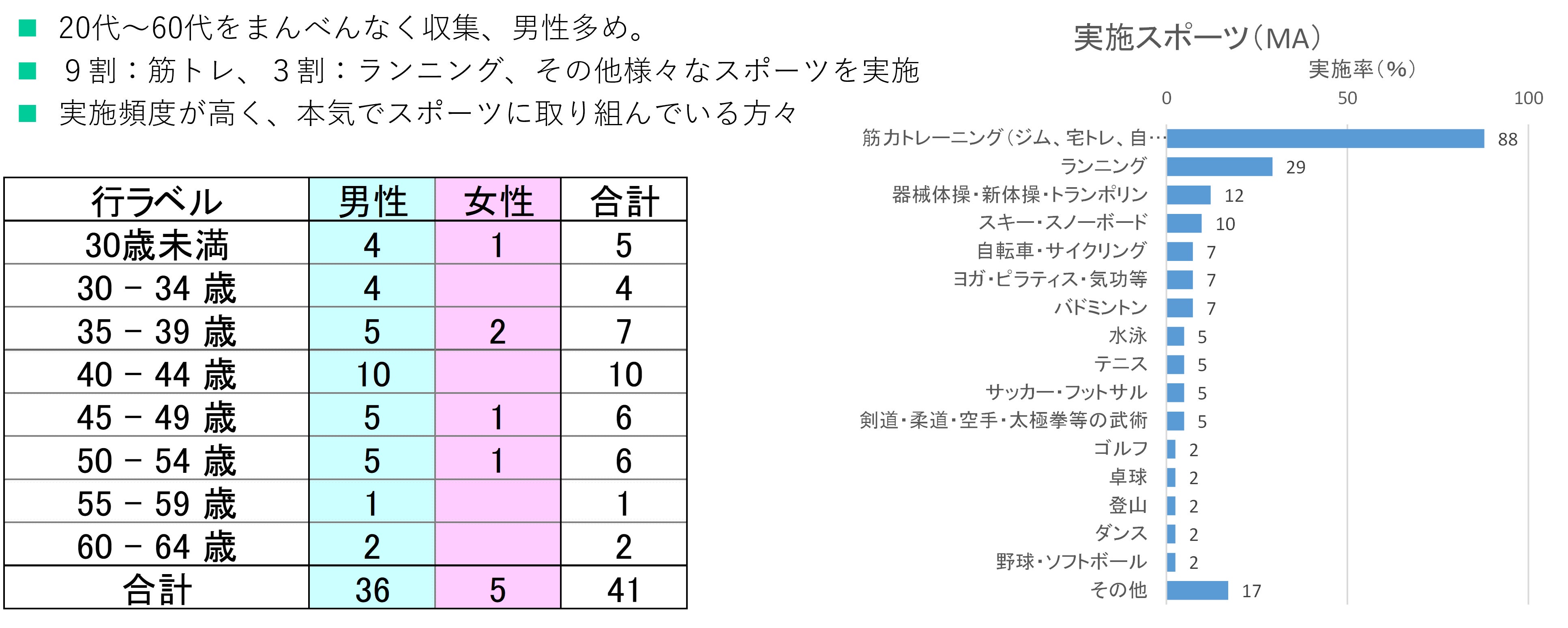 2023年8月、同時に進めていた『GLADIUS FIVE CARE』も完成し、ついにモニター試験を実施するまでに至りました。20代~60代のフォロワーさん41名が快く参加してくれました。驚くべきことに全員が1日18粒の摂取を1ヶ月間継続してくれて、摂取前後のアンケートにも答えてくれました。トレーニングをコツコツ継続している方々は本当に真面目で優しい人たちばかりだなぁと感動しました。