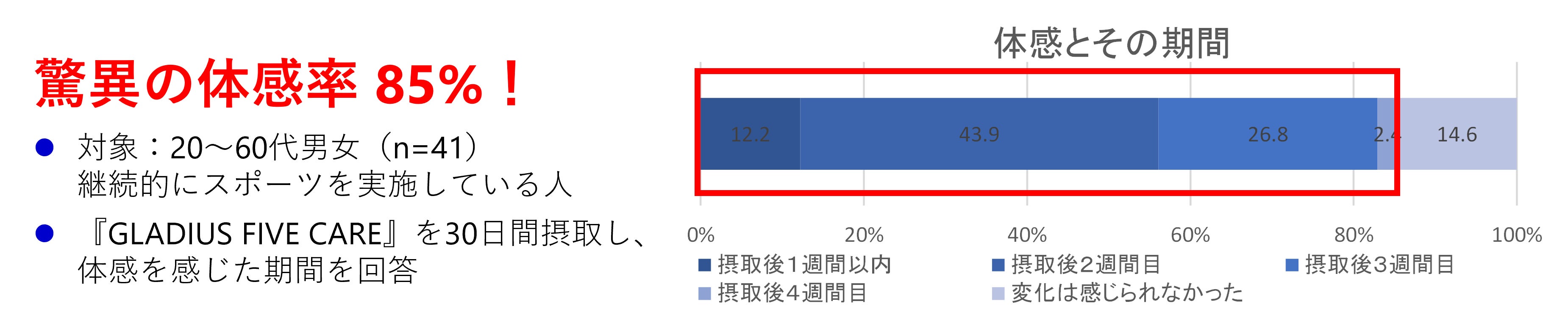 製品プロトタイプを用いたモニター調査では、驚異の体感率85%(n=41)を確認することが出来ました。私個人だけではなく、スポーツを愛し、生涯アスリートを目指して頑張っている全ての方々に、是非とも試して頂きたい商品です!