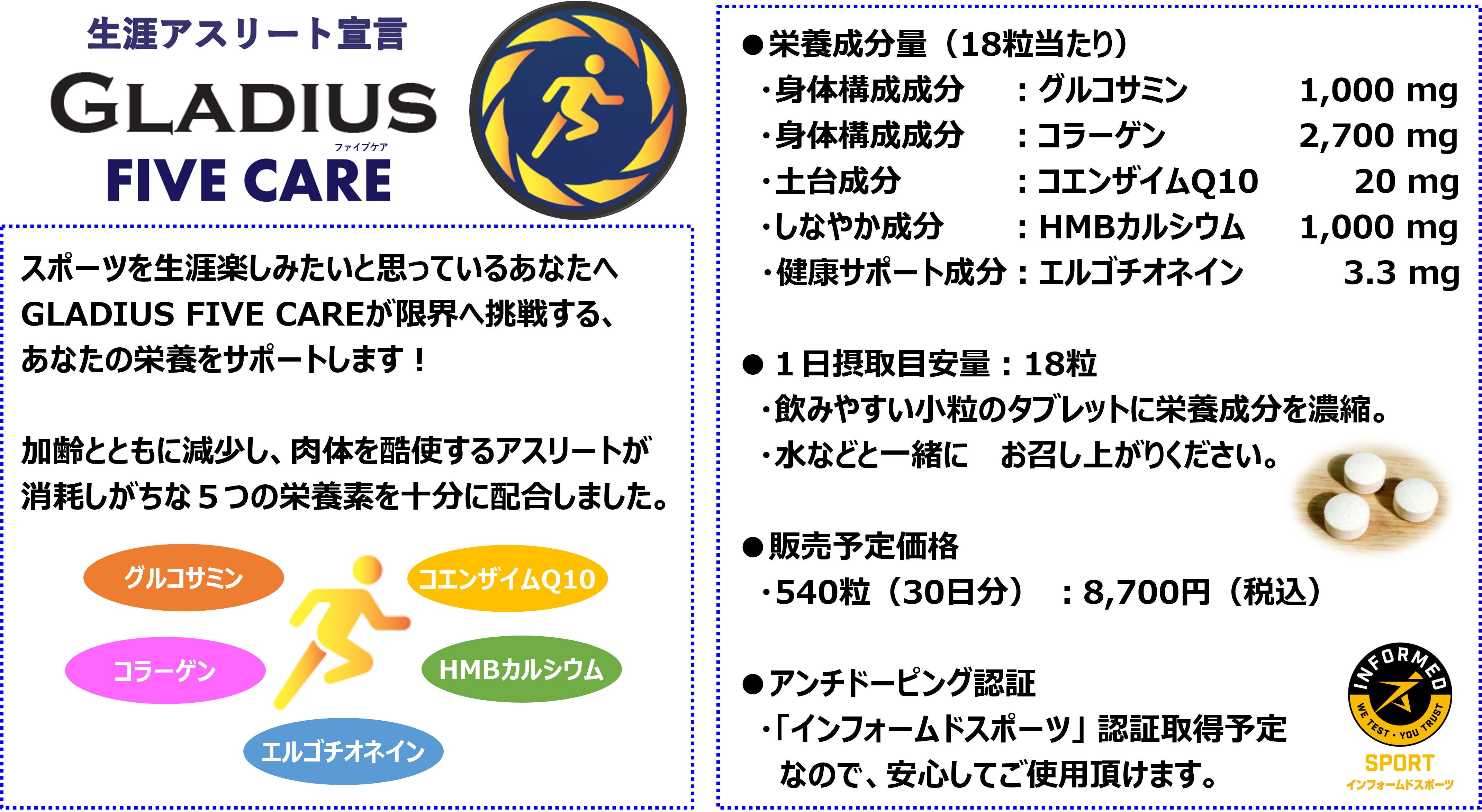 アスリートにとって、パフォーマンスの向上や健やかなトレーニングライフを維持するためには、日々の体づくりに欠かせない優れた栄養素を補うことが不可欠であると考えました。それに見合う栄養成分をひたすら探索していき、30歳でポジティブライフを応援する健康成分『グルコサミン』、33歳で体内に存在する生命活動に重要な補酵素『コエンザイムQ10』、43歳でスムーズな毎日に欠かせない『コラーゲン』、52歳でアスリートの筋力トレーニングを応援する『HMB』、日々のパフォーマンスを支える『エルゴチオネイン』に出会えました。30年間の研究を通じて『GLADIUS FIVE CARE』の5成分に辿り着くことが出来たのです。