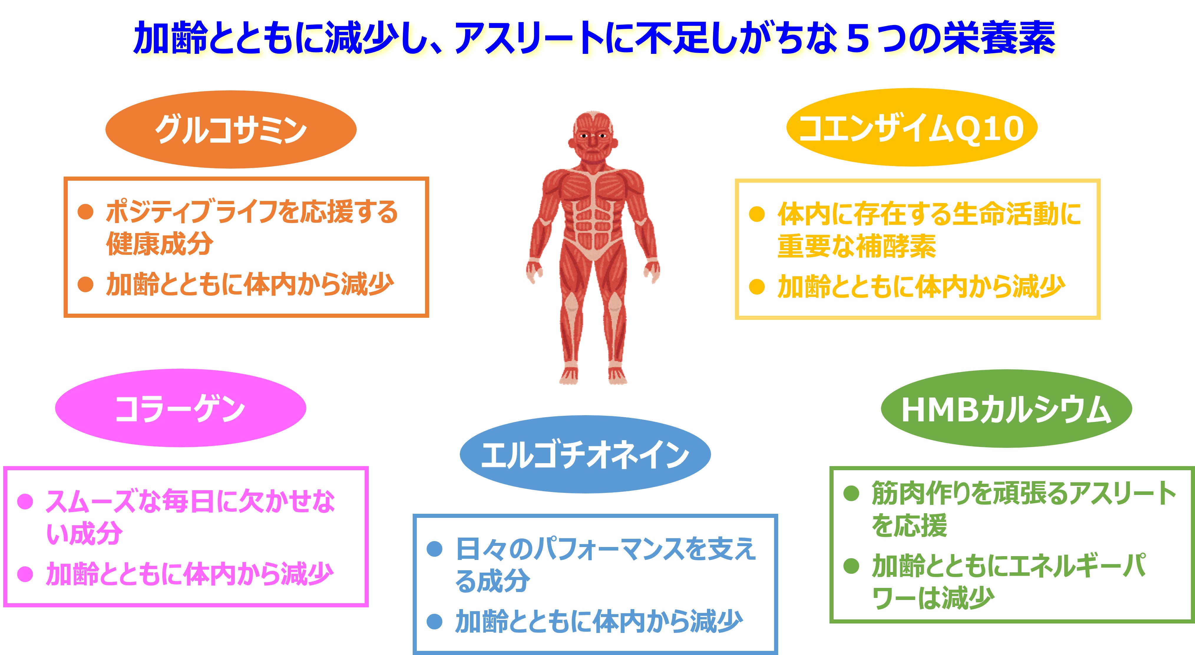 世の中には様々なサプリメントが発売されて情報も氾濫していて、どの成分を摂ればよいのか? どの成分が自分の悩みを解決してくれるのか? 本当に悩ましい状況だと思います。アスリートのパフォーマンスをサポートするという目的であれば、この5成分が必要かつ十分であると、私は現時点で結論づけています。もっと若くからこの5成分を摂取していたら、と思うほど54歳の現在は充実したトレーニング生活を過ごしています(笑)。