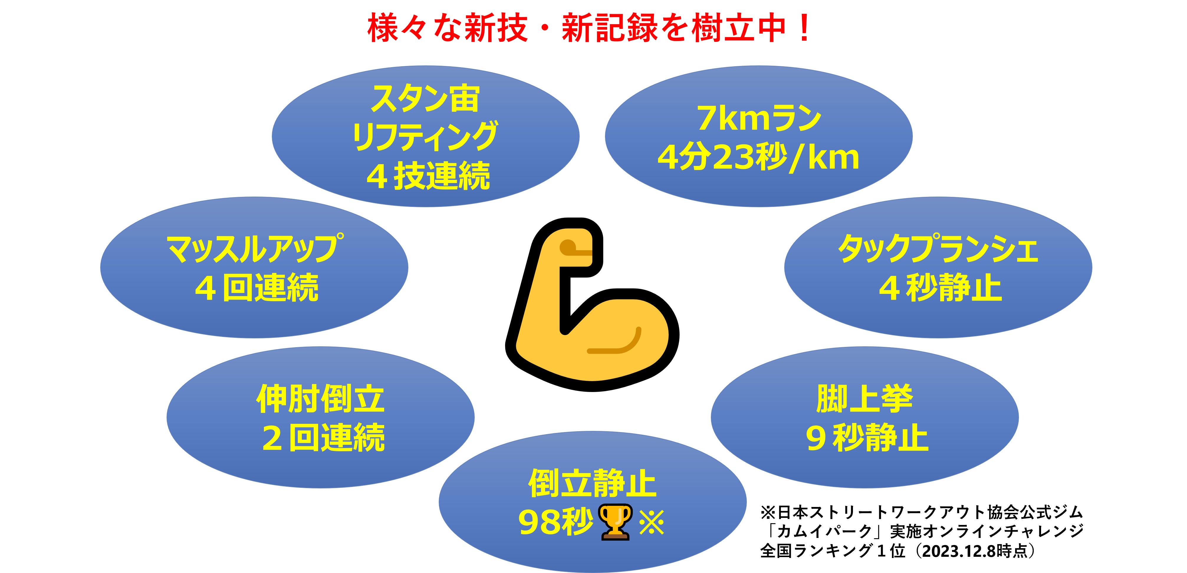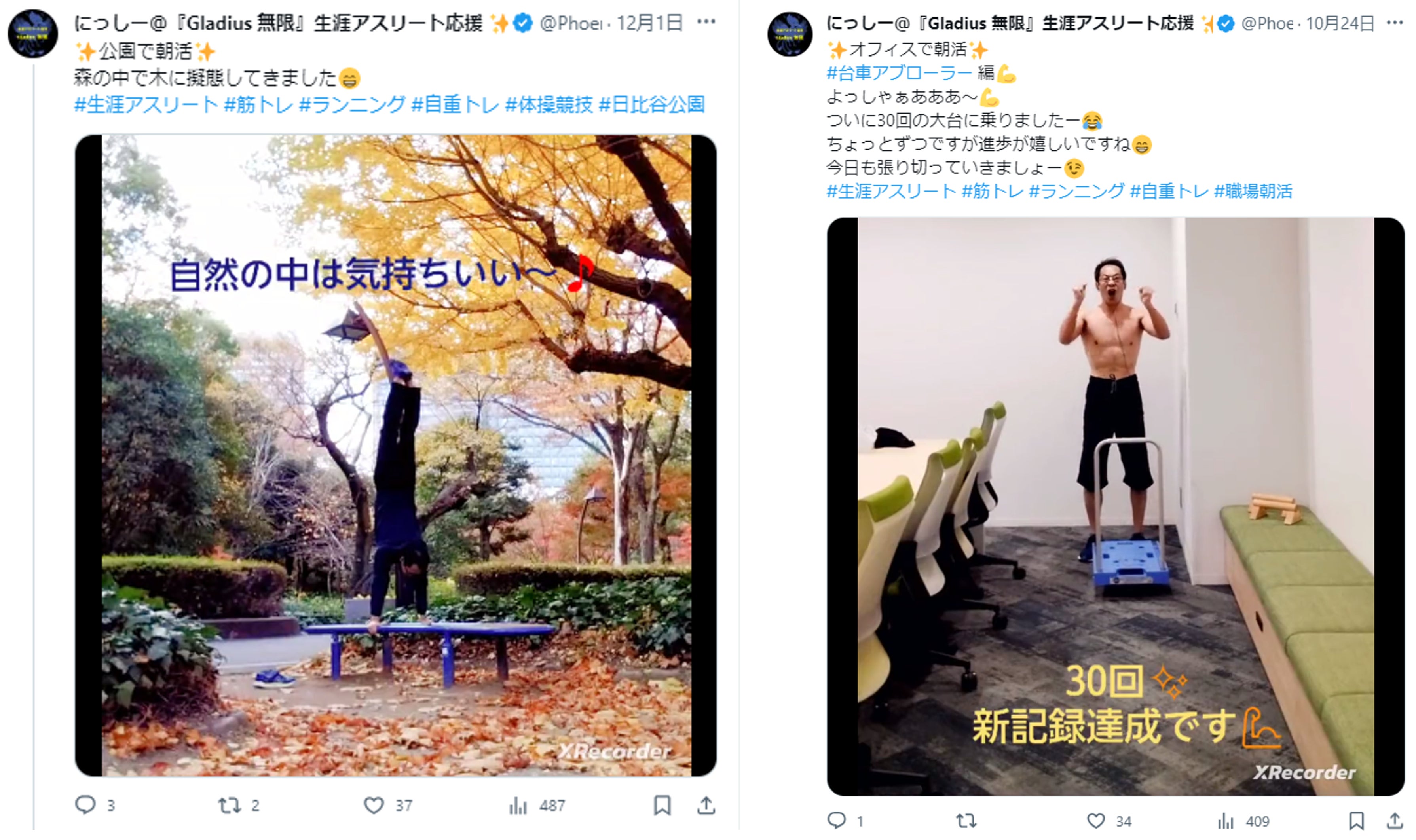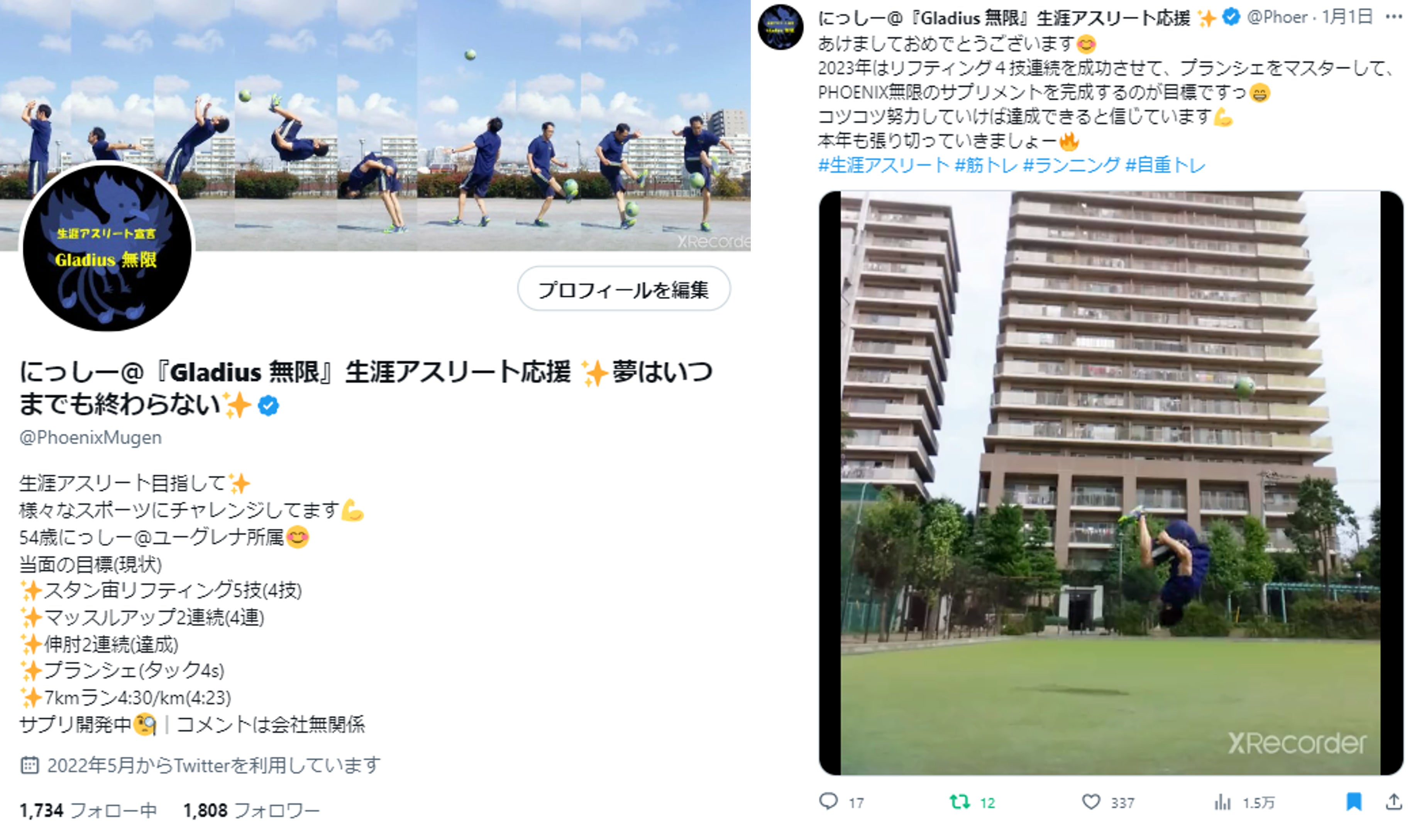 2022年5月にSNSを立ち上げ、1年半でフォロワー1,700人を突破しました。私と同じように「いつまでも強く・カッコ良くありたい」と願い、毎日筋トレやランニングなどのトレーニングを頑張っている方々が日本各地に大勢いることが分かりました!(推定人口267万人)。大勢の仲間たちと毎日、トレーニング動画を見せ合いながら励まし合い、私自身のトレーニングもますます充実したものとなりました。リアルでは出会うことが限られていた『生涯アスリート』を目指す大勢の仲間と出会い、トレーニング情報や悩みを話し合い、お互いに信頼関係を構築することが出来ました。ここで出会えた仲間たちは私にとって、一生大切な宝物のような存在です。