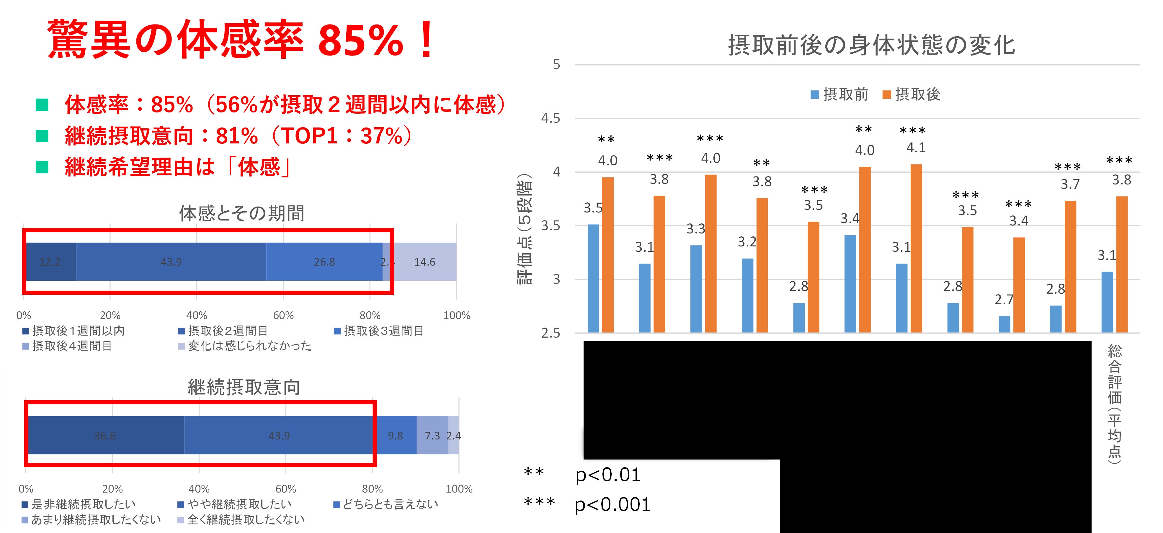 アンケートの結果は私の期待の更に上を行く、素晴らしい結果でした。なんと驚異の体感率85%をたたき出したのです。30年間ヘルスケアの研究開発に関わってきましたが、こんなにはっきりとデータに現れた商品を見たことはありません。