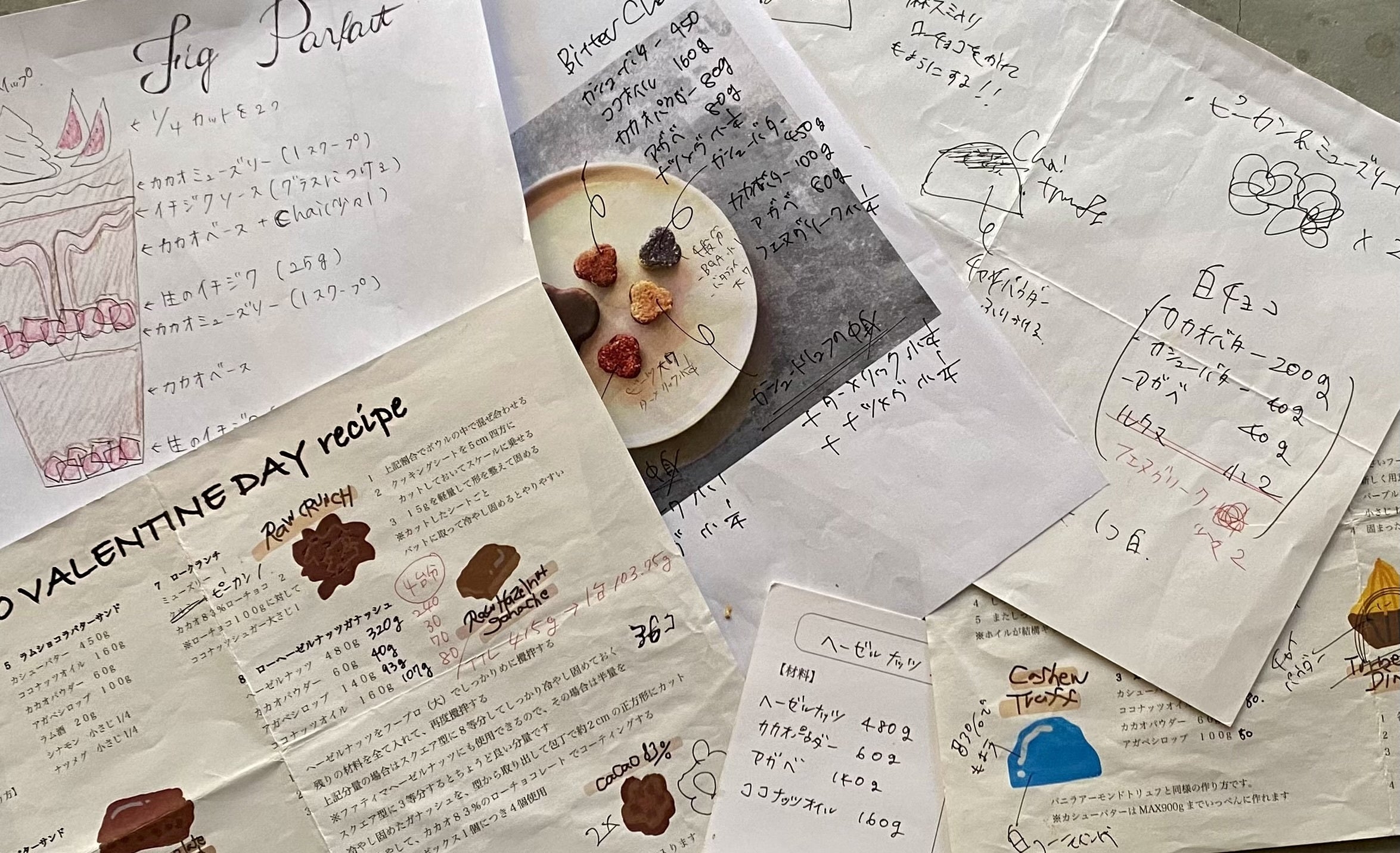 実際にレシピを作るとき、最初の工程は、こんな感じの手書きや殴り書きからスタート!こちらはスイーツやローチョコ系のレシピ。