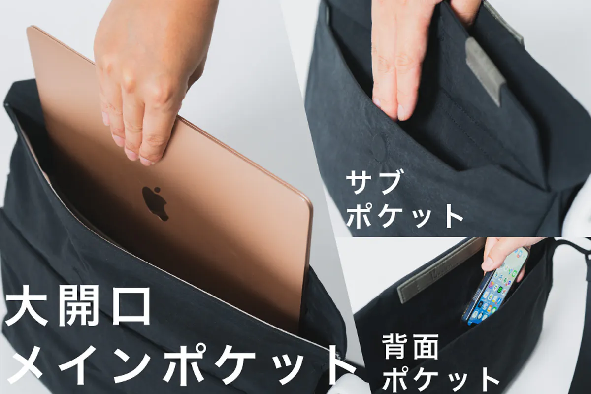 入り口に引っかかって荷物の出し入れがにくい、という不便な経験。それらを解消する「大開口ポケット」は大きな特徴のひとつ。14インチのノートパソコンがラクラク入ります。財布を入れるスモールポケット、スマートフォンを入れる背面