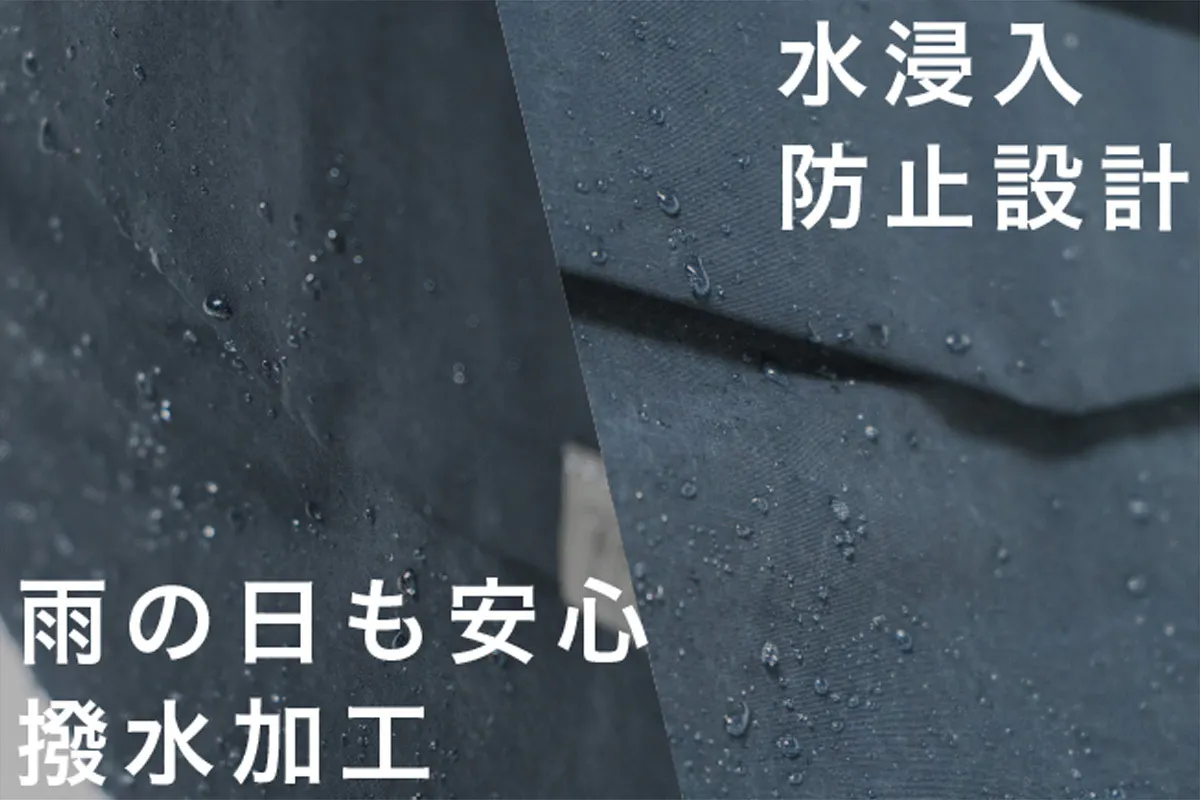 ❹「撥水加工」「水侵入防止設計」で突然の雨でも安心。