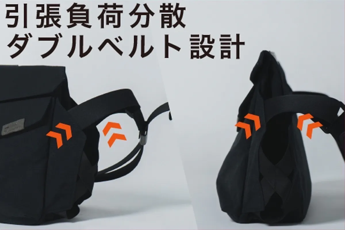 2本のベルトが重さを分散してくれるので、重い荷物を入れても、カバンに負荷がかかりにくいダブルベルト設計です。