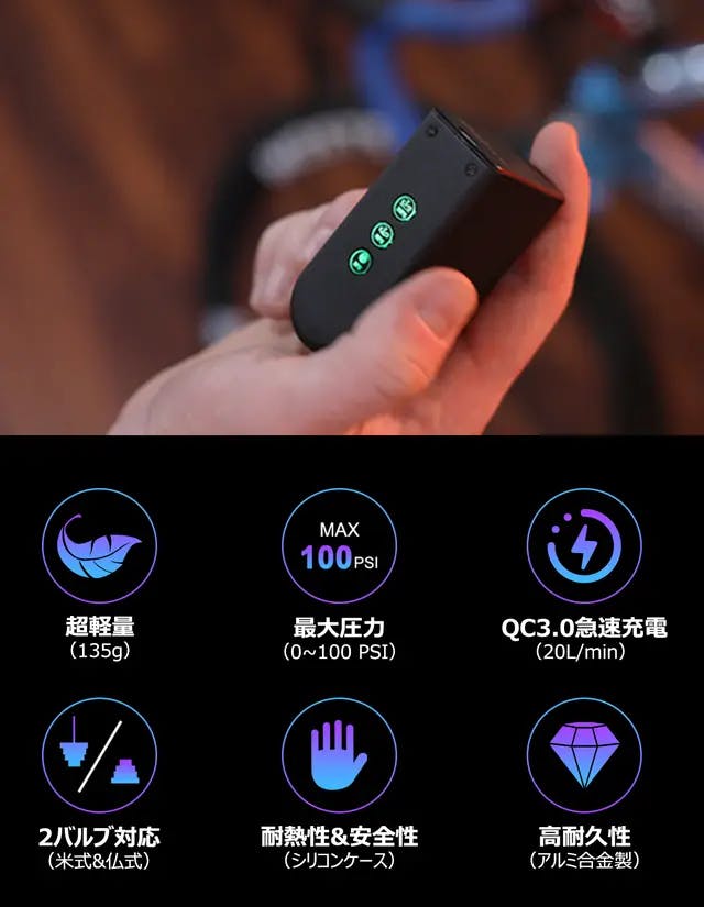 コンパクトなのにパワフルな性能。ロードバイク用タイヤを0PSIから100PSIまでわずか120秒でスピーディーに空気入れ完了。Type-Cポート採用で、20分でフル充電可能。1回の充電でロードバイク用タイヤ4本分の空気入れが可能!