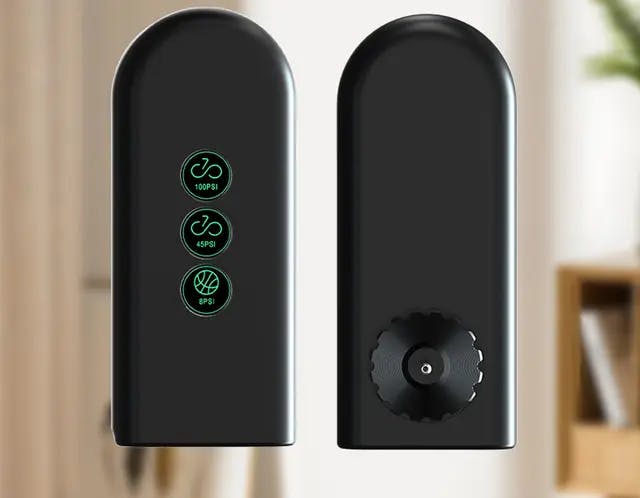3つのボタンを押すことで3つのモード(8 PSI、45 PSI、100 PSI)から選択できます。「AirGo」はモードを選択して空気入れを開始した後、設定された空気圧に達すると自動的に停止します。