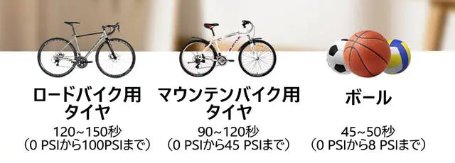 ※「120秒」は、メーカー独自のテストによって、700×25Cのロードバイク用タイヤを0 PSIから100 PSIまで空気注入するのにかかる時間を計算した結果です。