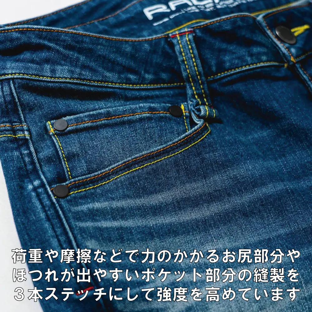 長距離ツーリング時など、荷重や摩擦などで力のかかる部分や、ほつれが出やすいポケット部分を3本ステッチにすることで縫製強度を高めています。ステッチが主張しすぎないよう、3本縫いの糸をジーンズと共色にすることで目立たないようにしています