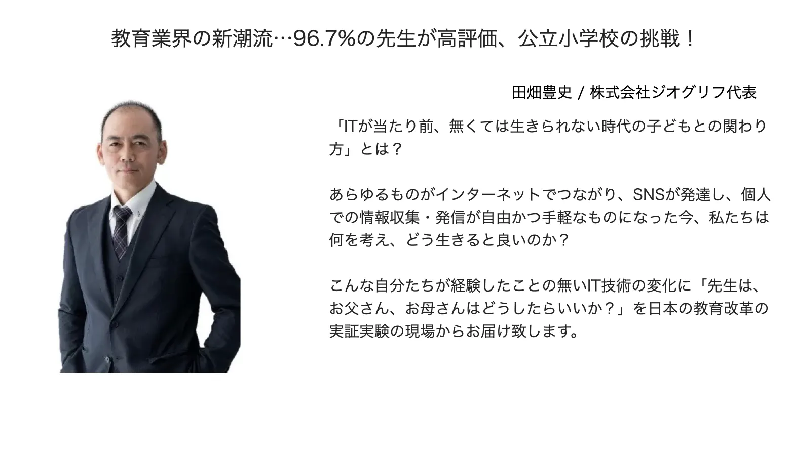 実際、弊社ジオグリフは、”テクノロジー×教育”分野で経営を行っているシステム開発会社なのですが、縁あって、兵庫県加西市にある公立小学校9校で、子どもとITに関する最新事例を踏まえたプロジェクトを行っています。