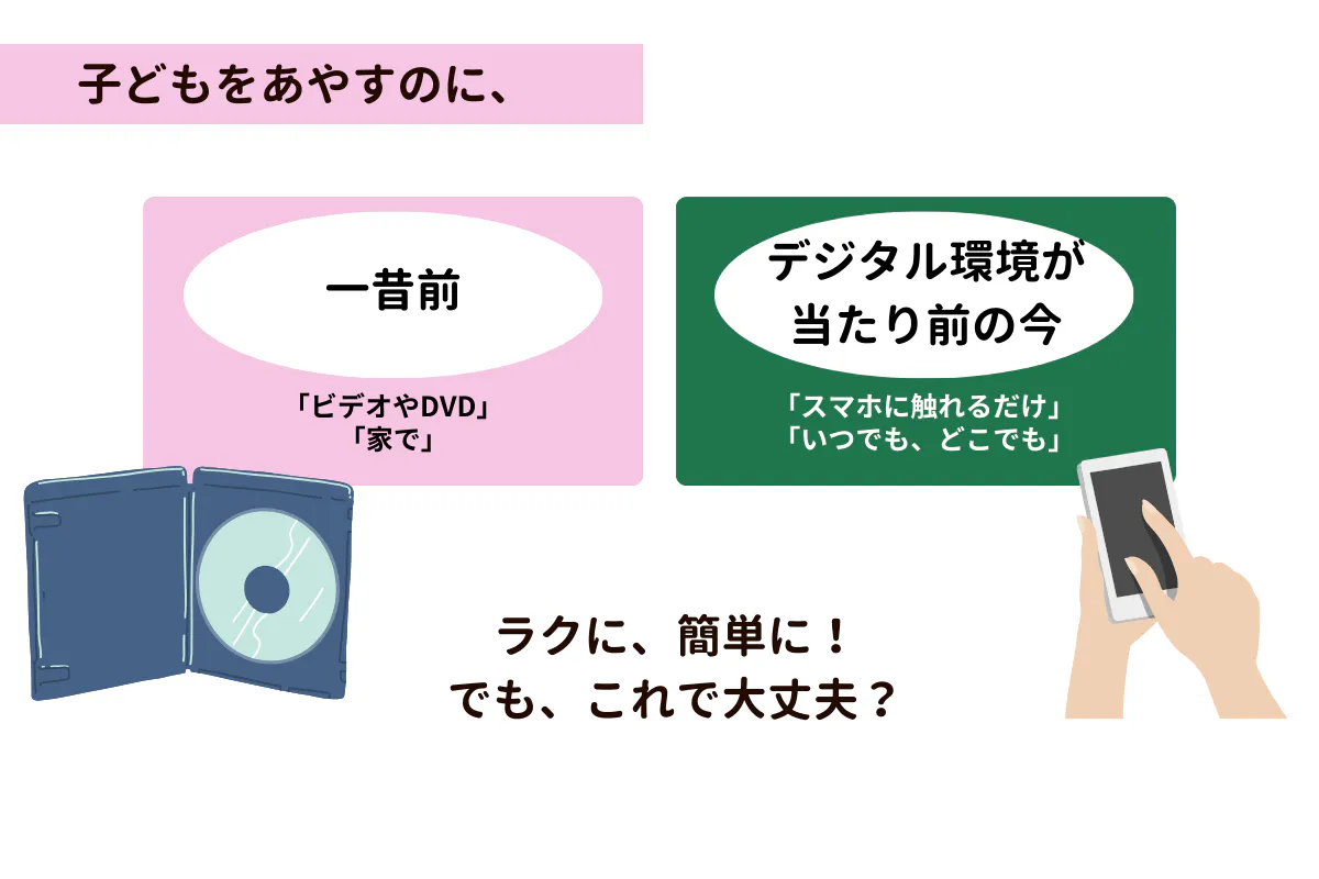 例えば、子どもをあやすのに、一昔前は「家で」「ビデオやDVD」を見せていたのが、今では「スマホに触れるだけ」で簡単に、「いつでも、どこでも」動画を流せます。