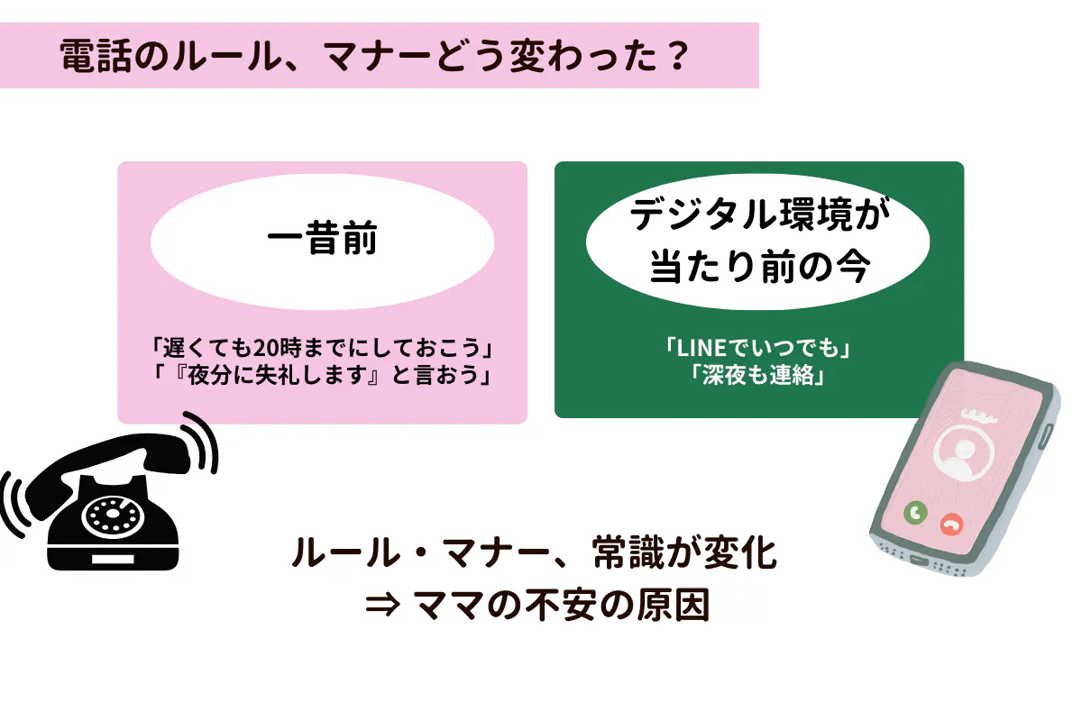 なので、「電話は遅くても20時までにしておこう」とか「『夜分に失礼します』と言ってから話そう」とか、最低限のルールやマナー、常識を親や家族から教えられ、どの家庭でも当たり前のように守っていたと思います。