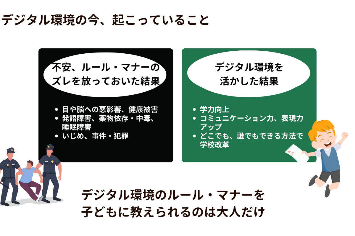 研究データ、実践例をもとに分かった新しいルールやマナー、これは守った方が良いというガイドラインなどを、【子どもとITの新常識】と名付けて、一人でも多くのママ、パパ、先生に選りすぐってお届けし、活かして頂けるようになっていけば、日本は変わり始めるのではないか、という想いで取り組みを始めました。