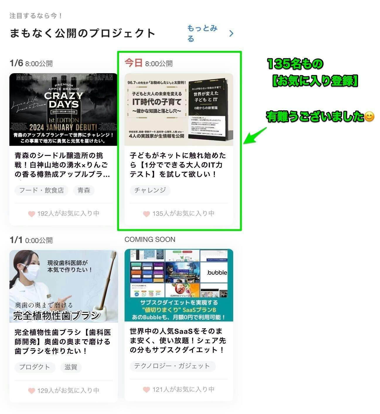 2023/12/29 20:08株式会社ジオグリフ 広報担当 小畑(おばた)です。本日から始まったクラウドファンディングですが、なんと、開始までに135名もの方から【お気に入り登録】を頂きました。おかでさまで画像の通り、『まもなく公開のプロジェクト』の上位に表示され、クラウドファンディング開始を迎えることができました。本当に有難うございました。また、本日19:30時点で、16名の方から合計、11万6,500円のご支援を頂いております。重ねて御礼を申し上げます。クラウドファンディングを始めた背景先日、弊社代表、田畑のFacebook投稿に次のような話がありました。ーーー以下、引用ーーー弊社は、多くの方々の力を借りながら「IT×教育」を定点観測していく自社メディア『koedo』(https://ko-edo.com/)を運営してきました。教育×ITを追い続ければ必然的にぶち当たる壁が「ネットトラブル」や「ネットいじめ」の問題です。JETRO対日投資喚起事業の採択を受けた「イスラエル製いじめ対策AIエンジンアプリの日本ローカライズプロジェクト」を進めながら、改めて「ITと子育て」、ITが変えてきた教育の構造をクラウドファウンディングを通して伝えていきたいと思っています。ーーー引用ここまでーーー現在、社会の変化に伴って教育、IT技術は大きく変化しています。ですが、ネットを利用するリテラシー、セーフティネットが整っておらず脆弱なのが今の日本です。そこで我々は、本クラウドファンディングのリターン動画【大人が知らない令和の子育て『世界が変えた子どもとIT 〜0歳からの新常識〜』】を通して、日本が直面している課題・解決策をお伝えしたいと考えました。【お気に入り登録】から【ご支援】のご協力を頂けますと幸いです。お子さんがおられるご家庭、子どもと接する機会の多い先生や保育士さんはもちろん、日本の未来を明るくしたいとお考えの方に、是非今回のリターン動画をご覧頂けると嬉しく思っています。これから一ヶ月間走り抜けて参ります。ワンコインで出来る、私たちの未来を変えるクラウドファンディングへのチャレンジを応援頂けますと幸いです。広報担当 小畑 もっと見る