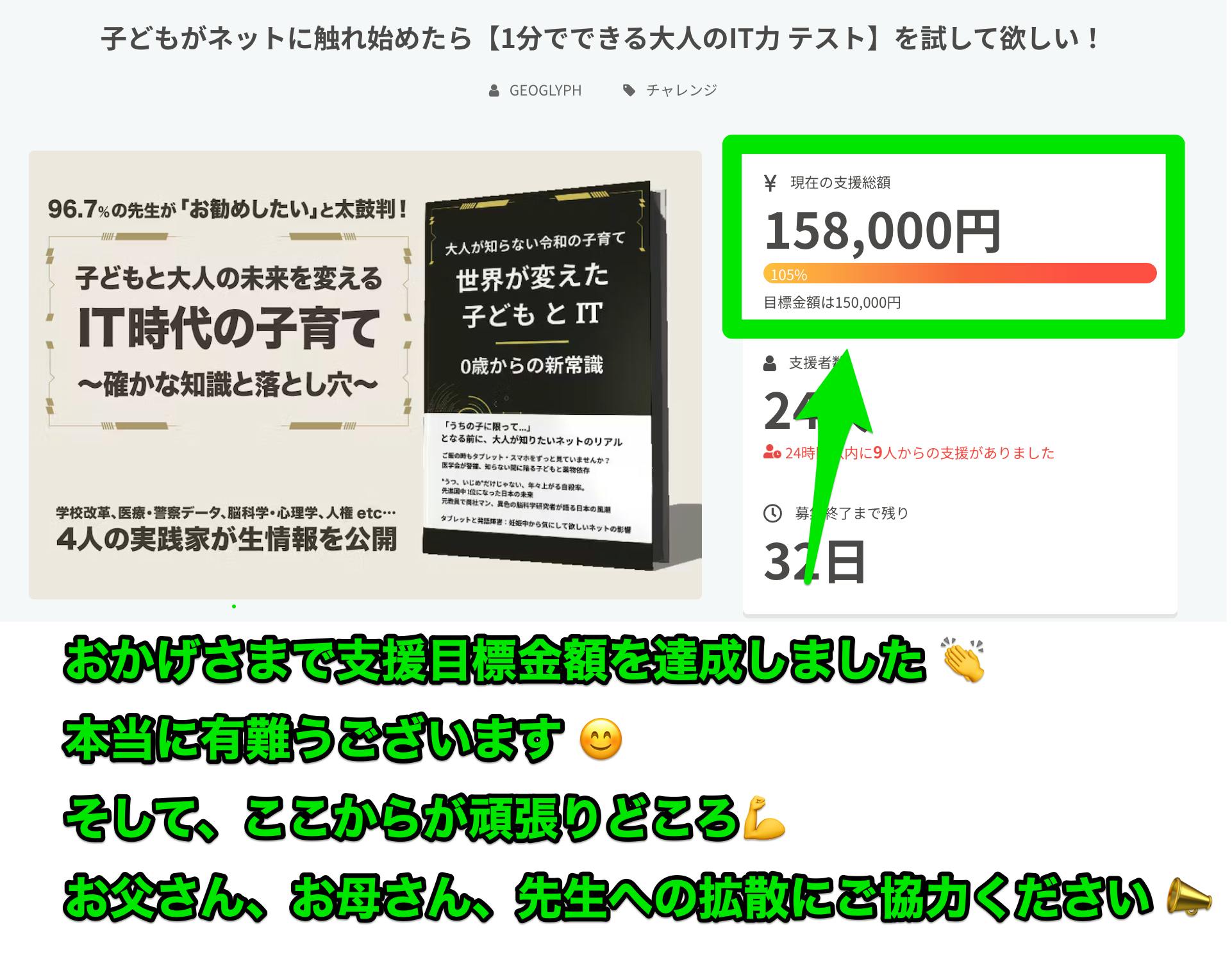 2023/12/30 19:40広報担当の小畑です。まずは、御礼から!お気に入り登録、そして、実際のリターン品ご支援を頂いたおかげで、2日目にして目標金額を達成できました!本当に有難うございます。メンバー 一同、心から御礼申し上げます。そして、ここからが本番と思って頑張ります!達成できたことは嬉しいのですが、私たちのチャレンジはここから!このクラウドファンディングの目的は、特に、 ● 妊娠期から中学生くらいまでのお子さんがおられる方 ● 先生を含め、そのくらいの年齢の子どもが身近にいる方にページをご覧頂いて、今の【ネットと子どもの新常識】をお伝えすることです。そして、関心をお持ち頂けたのであれば、動画インタビュー(リターン品)を通して、「正しい知識」を元に【新常識】を手にして頂きたいと想っています。リターン動画をご覧頂ければ、ネットに関してこんな確かな知識が手に入ります…動画の中では、ネットに関して、 ● 家庭でも、学校でもできる、子どもの能力を高める方法 ● You Tubeに関わらず動画視聴が、子どもに与える影響 ● 子どもを妊娠中から、まわりの大人が知っていて欲しい健康被害の実態 ● デジタルネイティブだからこそ持つ、大人と違う常識、それによる犯罪被害 ● 子どもが被害者にも加害者にもならないために、大人が家で子どもに教えるべきことなどを予定しています。これらはほんの一例ですが、分かりやすく、お役に立てる確かな情報をお届け出来るよう動いております。ワンコインでお子さんの、大人の未来が変わる。とても投資対効果の高いクラウドファンディングを目指して。今回はたった【500円】で、ネットを通した子どもの能力upだけではなく、子どもを健康被害や犯罪から守ってあげられる確かな知識が手に入ります。「子どもの明るい未来に対して、とても良いお金の使い方だった」と思って頂けるリターン動画とpdf版冊子をお届け出来るよう頑張っております。年末年始、ご家族が集まるこの時期だからこそ、ご自身はもちろん、周りの方にもこのクラウドファンディングのことをお話頂けると嬉しいです(^^)引き続きのご支援、拡散を何卒宜しくお願い致します!広報担当 小畑 もっと見る