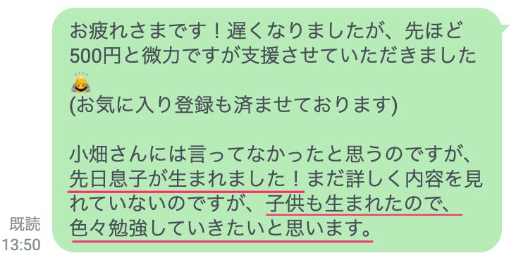 2023/12/31 23:03こんばんは。広報担当の小畑です。クラウドファンディングのご支援、有難うございます(^^)本日は、支援者様から嬉しいお声を頂いたので掲載させて頂きました!『先日息子が生まれました!子供も生まれたので、色々勉強していきたいと思います』というメッセージで、子どもが生まれて間もない彼が、今回のクラウドファンディングに関心をもってくれたのをとても嬉しく思いました。お父さんになったばかりの彼は「子どもの未来が明るくなるように」と願って支援をしてくれたことでしょう。きっと、こういった想いをもつのは彼だけではなく、多くのお父さん、お母さんに共通することだと思います。そして、今回クラウドファンディングをご支援頂いているお一人お一人もまた、子どもたちの明るい未来を願っておられるのではと思っています(^^)改めて、このような「温かい気持ちで応援をしてくださっているみなさんのシェア」で、今回のクラウドファンディングは成り立っているのだと感じながら、本日は広報活動をさせて頂いておりました。もう間もなく年が明け、2024年が始まります。今回、ご支援・お気に入り登録をして頂いた方はもちろん、これからこのクラウドファンディングと出会う方お一人お一人の未来が明るく、幸せであふれることをお祈りして、今年最後の投稿とさせて頂きます。また、来年も何卒宜しくお願い致します。広報担当 小畑p.s.お正月はご家族・親戚で集まったり、同級生・友人と初詣に行くなど、色々な方と顔を合わせることの多いタイミング。お子さんやお孫さんのことで、ネットの不安に関する話題が出た時には、このクラウドファンディングのことを思い出して頂けると嬉しく思います(^^) もっと見る