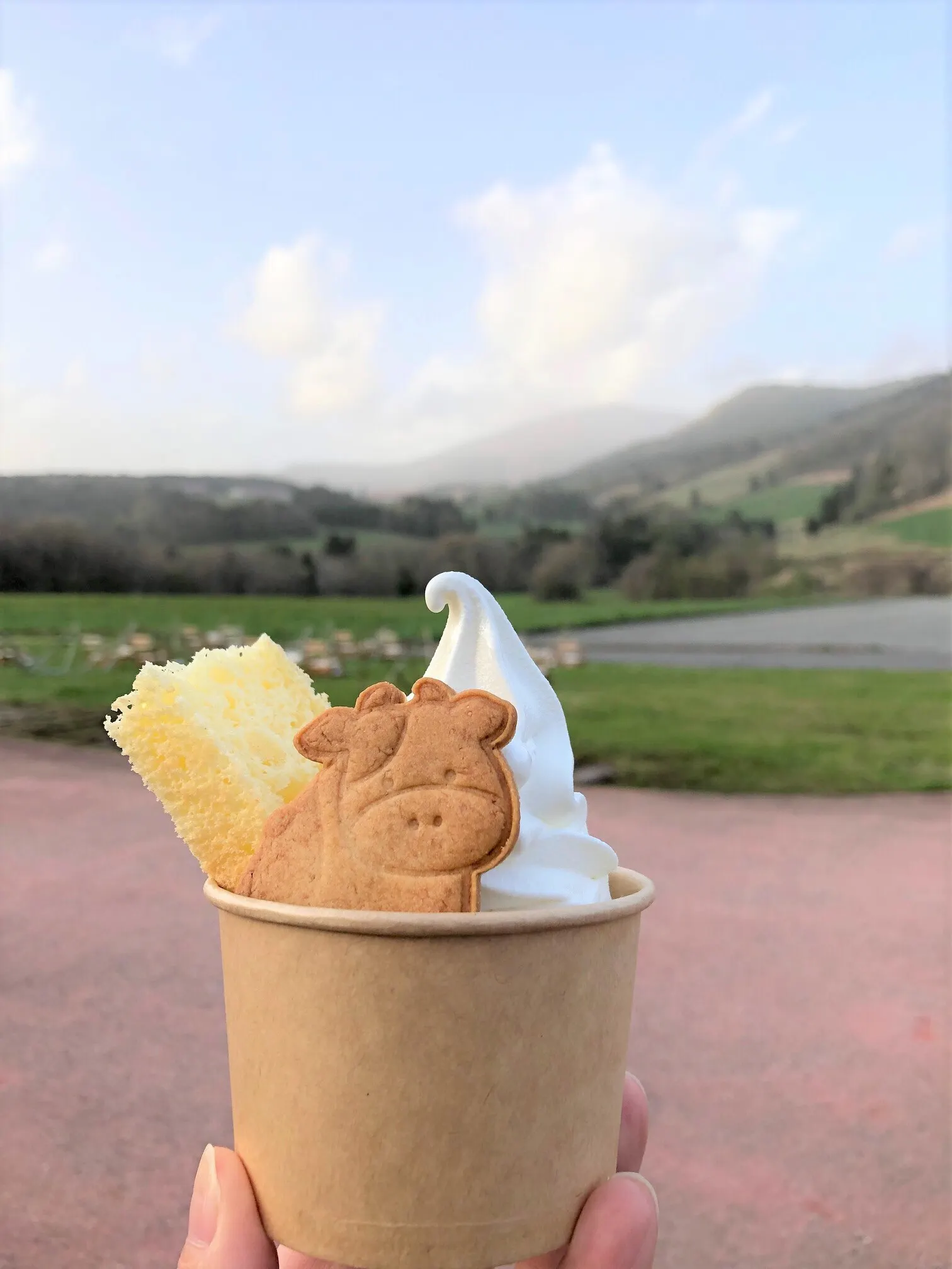 六呂師高原 生乳を使ったソフトクリームとシフォンケーキのコラボにmoumouクッキーをトッピングしました