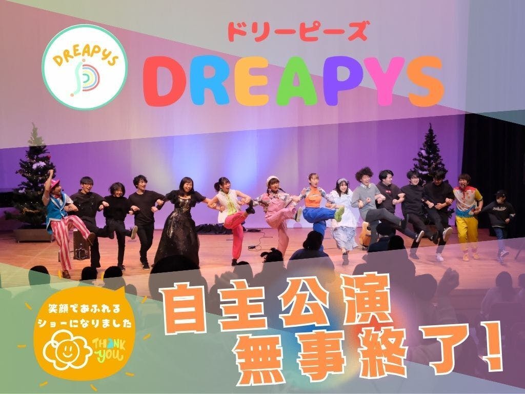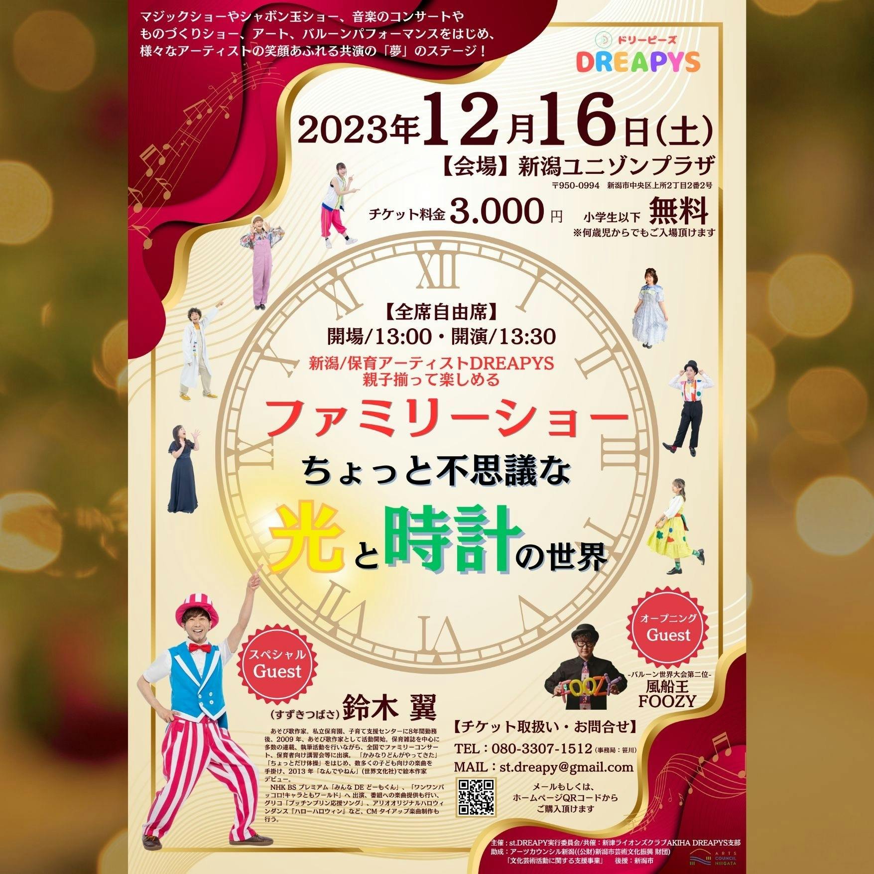 2024/01/15 18:282023年12月16日(土)〜ありがとうございました!〜 新潟にある「ユニゾンプラザ」の会場にて、DREAPYS主催の“ファミリーショー”を行いました。沢山のスタッフの方、協賛いただいた方々、お客さまのお陰で無事終えることができました。〜感謝〜 今回の裏方メンバーのスタッフは、ほとんどが【保育】に携わっている子達だったり、【子ども】が大好きなメンバーです! 「子ども達に笑顔を届けたい!」という私たちの思いに賛同し、快く手伝ってくれた最高のメンバーです!新潟はこんなに“あったけぇ〜しょ(温かい人)”がいっぱいいるんです! 「人は1人では生きていけない」という名言がありますが、得意不得意があって当然で、補いあって協力することで、前に進んでいけます! 今回の公演で改めて人の温かさや大切さ、そして人と関わる楽しさや感謝の気持ちを再確認しました。この世に不必要な人なんていません! 私たち大人が楽しく、そして温かい気持ちでいることが、子ども達にたくさんの「笑顔」を届けられる一番の近道になると思います!みんながhappyでいれる世界に!〜DREAPYSパフォーマンス〜テーマは「光と時計」 “人生の一瞬一瞬が宝物で大切な時間なんだ。そして辛いことも楽しいことも全てに意味があって、乗り越えた先ではどれもキラキラ輝いて見える。感謝の気持ちを大切に…” だいぶ壮大な思いが込められていますが、DREAPYS全7名のパフォーマーがテーマに沿った内容で皆様に笑顔をお届けしました! 子ども達へ、ママ・パパ達へ、先生達へ、お世話になっている方々へ…色んな方が楽しめる内容を心がけました。そして一番は、私たちが楽しむこと。十人十色の感じ方があったと思います。楽しい気持ちや感じたことを、心のお土産にしてもらえたら嬉しいです!一緒に楽しもう ショーの中では、あらかじめお子様1人1個【光るペンダント】を配り、付けたり振ったりして参加できるような内容にしました。このペンダントも、保育士の経験を活かし、ご家庭や保育園等でも作れて、子ども達も簡単に安全に遊べるような仕様にしました!左:お客様写真提供 右:光のペンダント〜オープニングパフォーマンスゲスト〜 新潟で大活躍中の大先輩!日頃からお世話になっております【風船王Foozyさん】をお招きし、会場のバイブスを上げていただきました! 会場からは、子ども達の楽しそうな声はもちろん。大人のクスッと笑う声も聞こえてきまして、こちらまでニヤッとしてしまうような楽しいパフォーマンスです!私も大好きです^^ありがとうございました!風船王Foozyさん さらに、フォトブースも作っていただきまして、お客さまからも大好評でした!テーマ【光と時計のちょっと不思議な世界】にばっちりの装飾です!!Foozyさんのフォトブースお客様から写真提供〜スペシャルゲスト〜 あの【鈴木翼さん】と【ガーガーズのしんごさん】をお招きし、なんとも豪華な内容に! 学生時代・保育士時代から、鈴木翼さんの手遊びやパネルシアター・歌遊びなどで、沢山子ども達と遊ばせていただき、DREAPYSメンバーも大好きなアーティスト様です! お二人と一緒の舞台に立てることは本当に光栄ですし、沢山学ばせていただきたいという思い・新潟の子ども達に楽しんでほしい!という思いで、僭越ながらお招きさせていただきました…!ここまでご支援くださった方々に、心より感謝申し上げます。左:鈴木翼さん 右上:ガーガーズしんごさん 新潟の保育園でも、日頃の手遊びや歌遊び、お遊戯会などでもお二人の曲が大人気!なじみの曲が始まると、会場の声も自然と大きくなりました^^ 「大人も一緒に楽しめて、沢山笑いました!」「楽しかったです!」「すごかった!」などなど、お客さまからの声も聞かれ、大反響でした!ありがとうございました。 私達のような、駆け出しのアーティストにも近い距離で関わってくださるお二人の温かさ・謙虚さ・行動力・パワー・発想・探究心…上げきれませんが、本当に全てがリスペクトです。今回の公演でたくさんの学びや、ありがたすぎるお言葉もいただき、私達も更にパワーアップしていきたい!という思いになりました。ありがとうございます!〜今後〜 無事2023年の主催公演が終了し、たくさんの方々にご支援・ご協力いただき、感謝申し上げます。ありがとうございました。 たくさんの課題が出ましたが、メンバーそれぞれがまた1歩大きく成長できました。また、皆様の笑顔やお声を身近で感じることができ、ステージならではの特別感も出しつつ、ステージを飛び越えて、皆様と近い距離で関わることができたアットホームなショーにもなり、私達(DREAPYS)らしい内容になったと思います。 今後も活動を続けていきたい!そんな思いが更に強まりました。 しかし…今回の公演でかかった費用に関しましては、自費の部分がまだまだ沢山あります。活動を続けていくには、資金が必要なのが現実…どうか、皆様のお力をお借りできないでしょうか? 今後は、新潟の保育