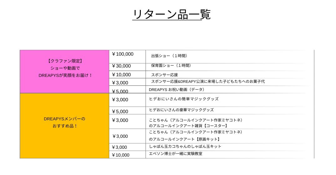 実際にDREAPYSを呼んでショーを見れるものから、お祝い動画・各パフォーマーが提案した楽しいワークショップ等…様々な種類のリターン品をご用意させていただきました!