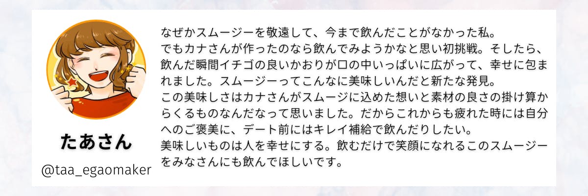 「KANAU SMOOTHIEに出会えて良かった」という人を1人でも多く、笑顔を作りたい。